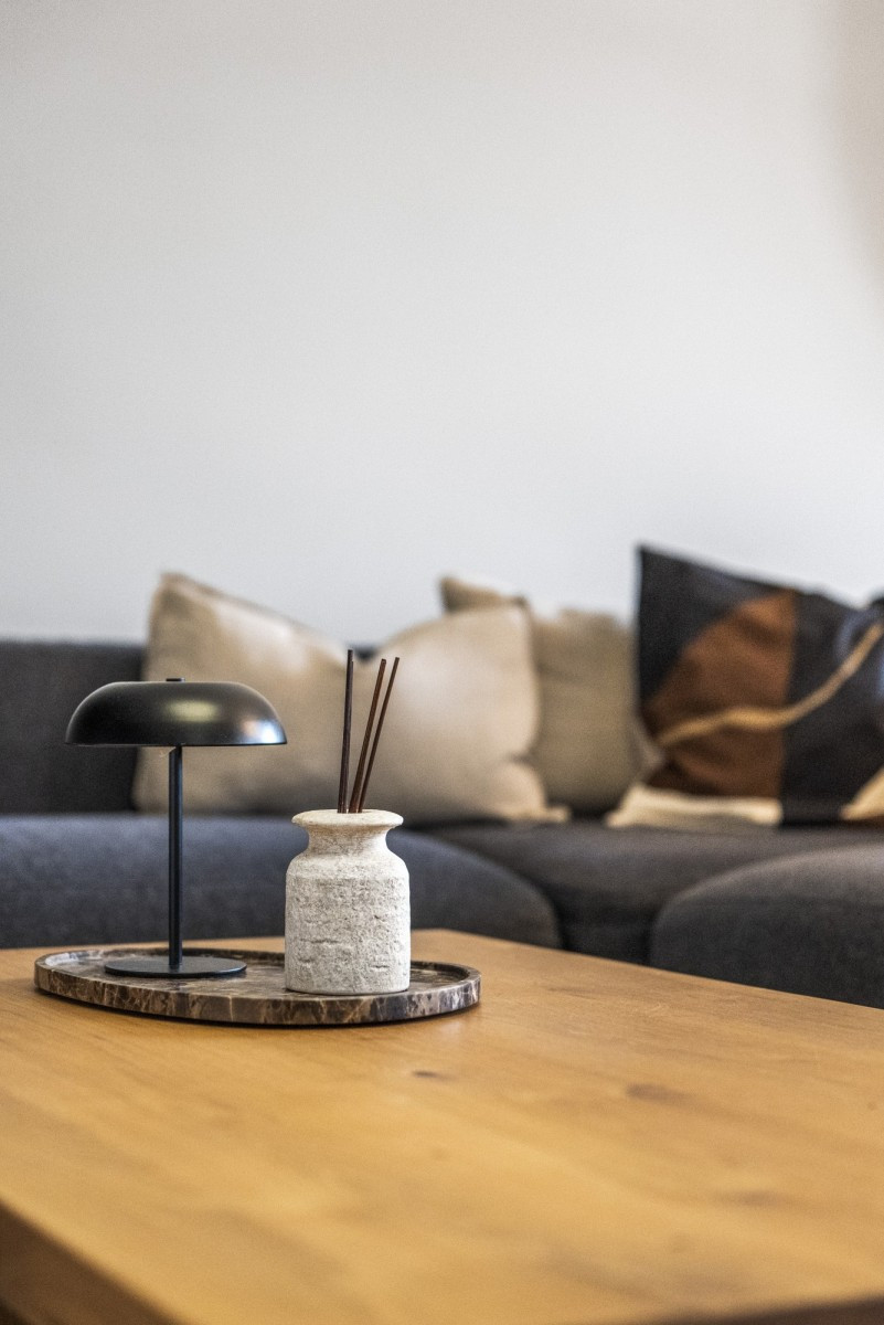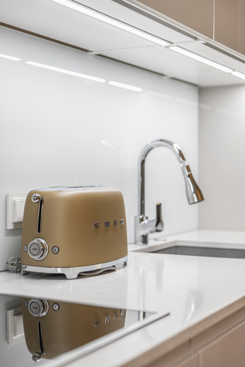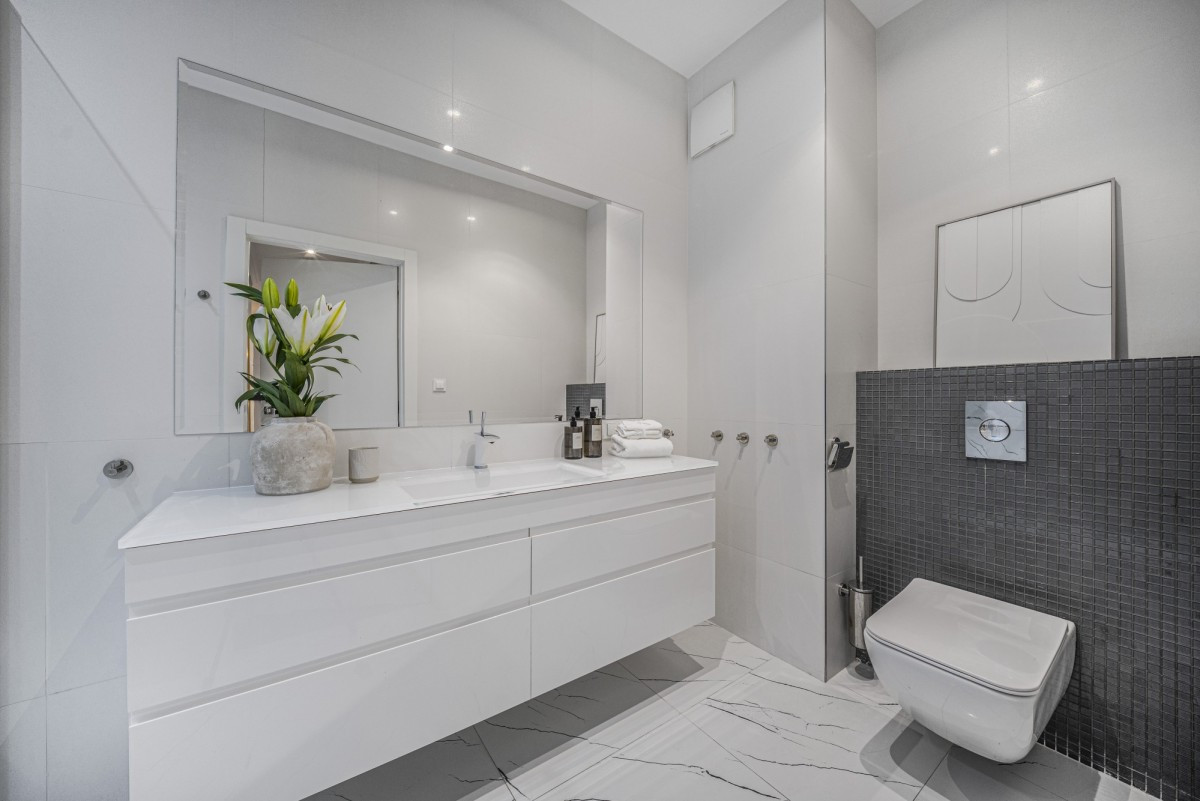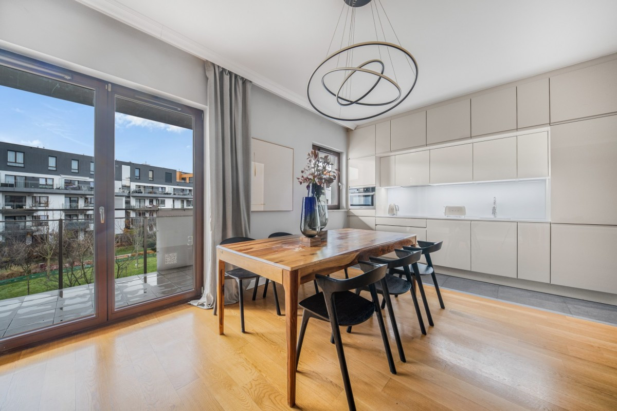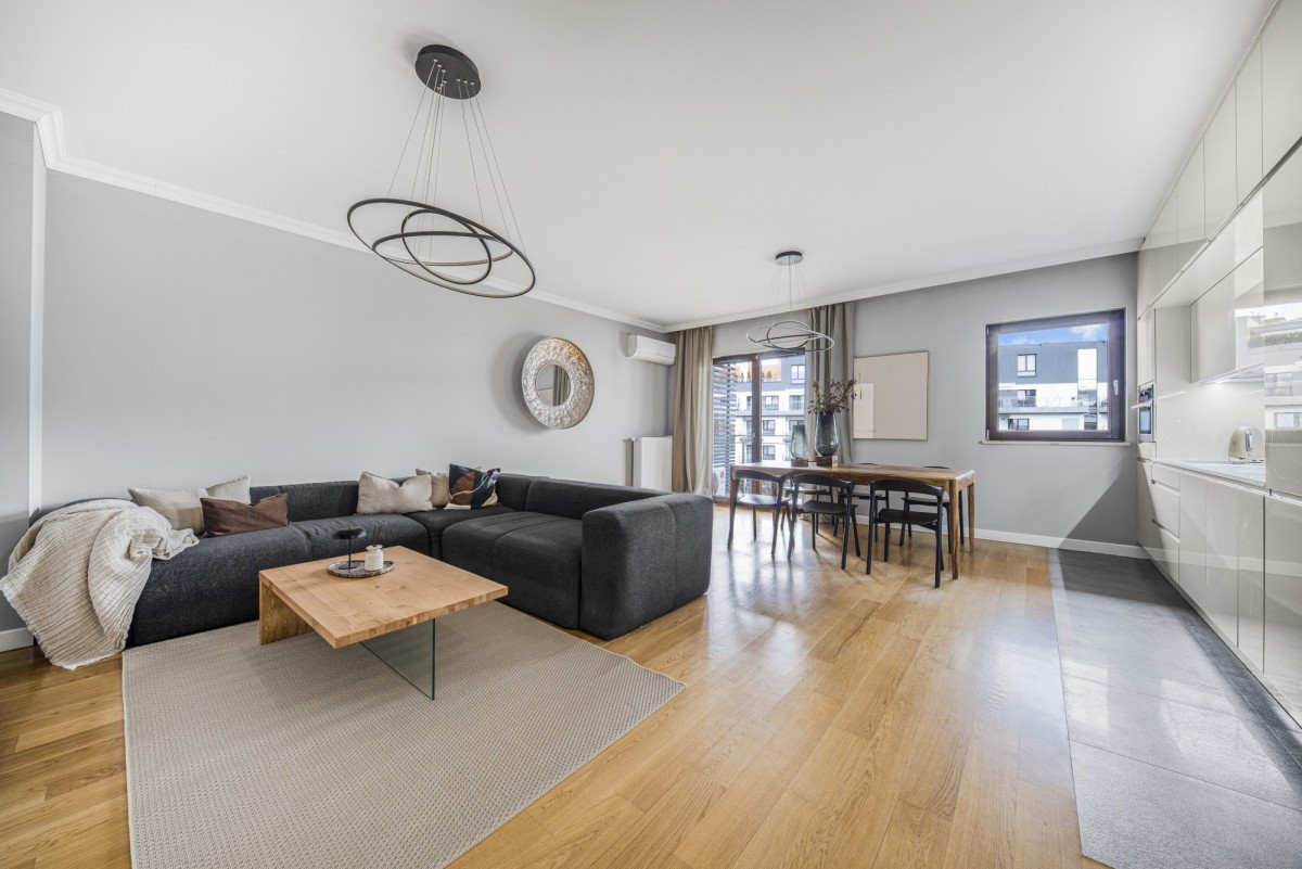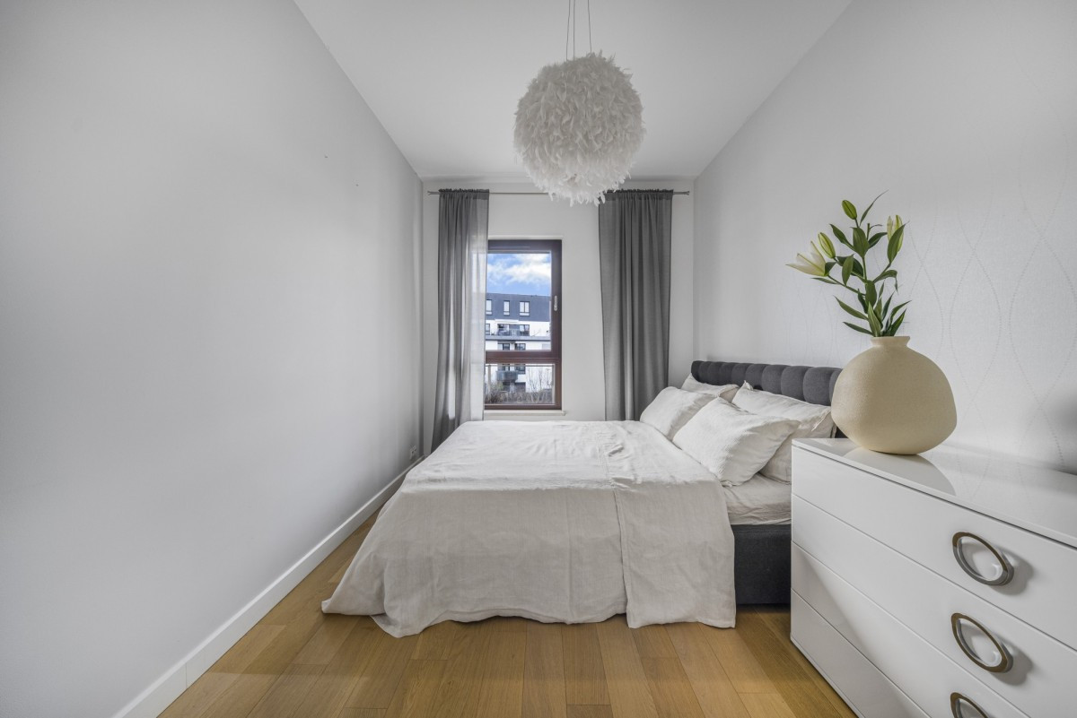 Wnętrze zostało zaprojektowane przez architekta z dbałością o każdy detal. Apartament wykończono w podwyższonym standardzie, z wykorzystaniem naturalnych materiałów - drewniana dębowa podłoga, meble na wymiar, nowoczesnej strukturze. Dominująca paleta barw w odcieniach bieli, beżu i szarości tworzy atmosferę spokoju, harmonii i ponadczasowej elegancji.
