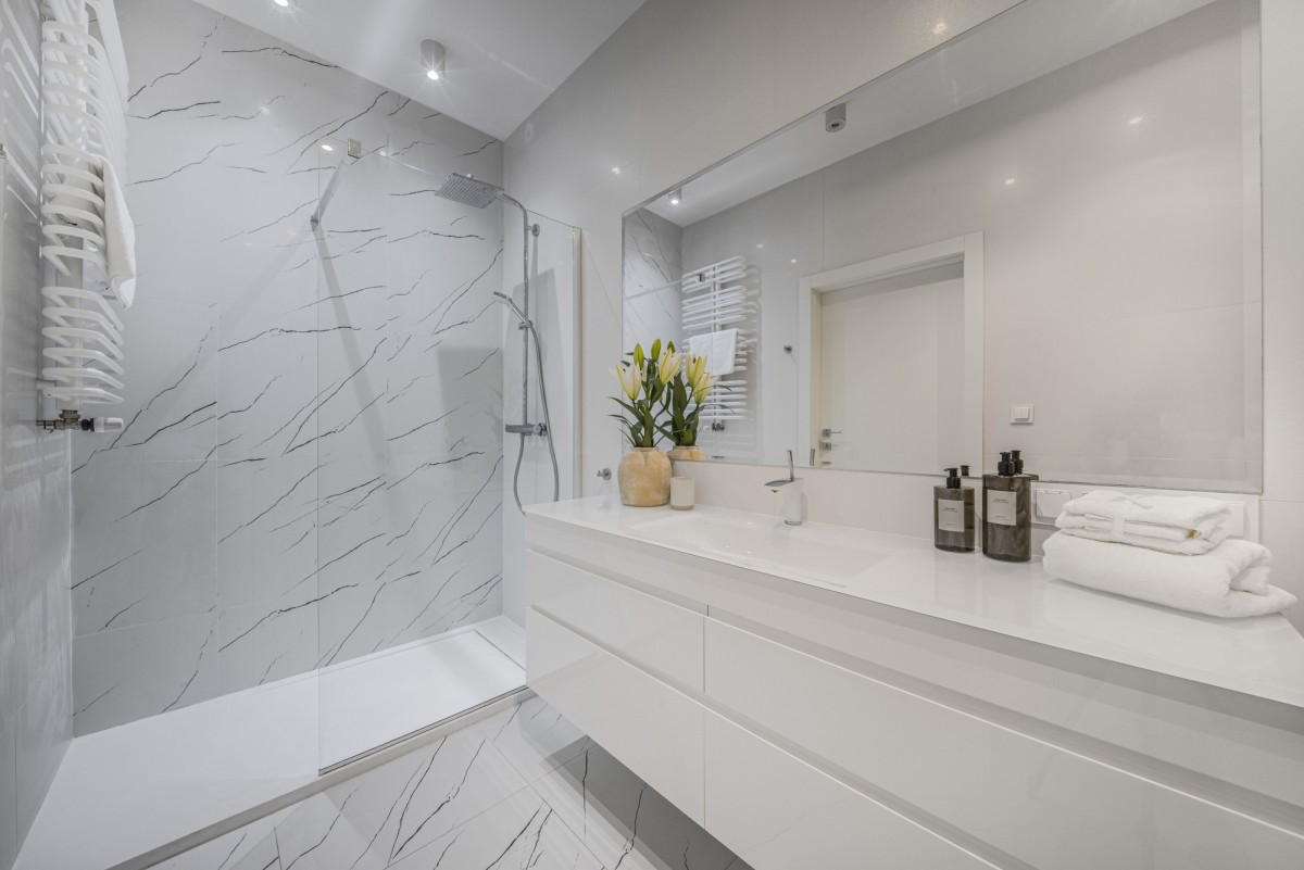 Łazienka z prysznicem - baterie najlepszej klasy (ok. 4,5m²), wykończona w spójnym stylu.