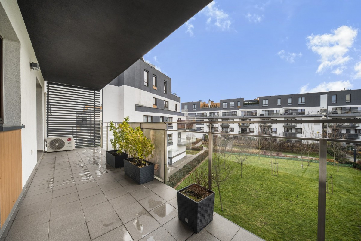 Widok z dużego balkonu (16m2) na ciche zielone patio