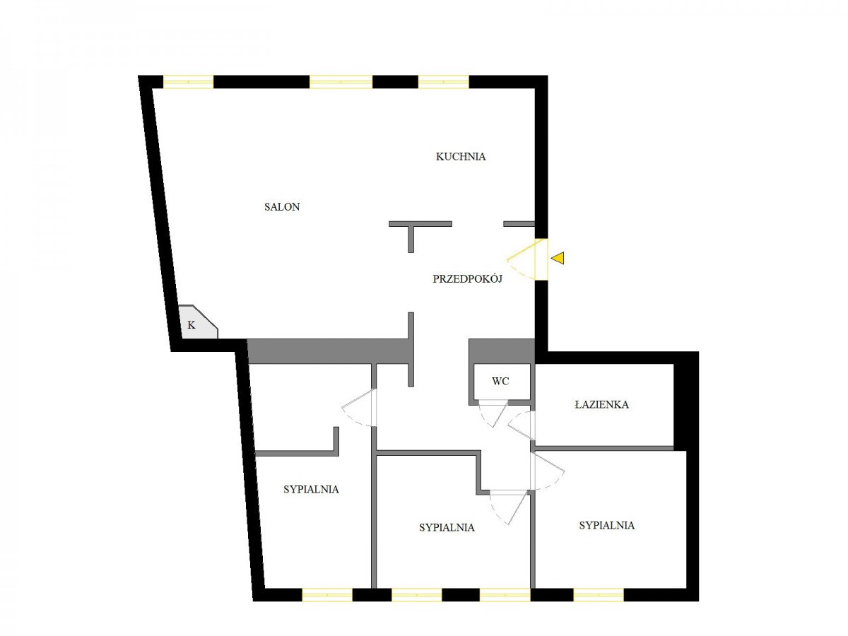 Mieszkanie składa się z przestronnego salonu z kuchnią (ekspozycja zachodnia) oraz trzech sypialni od strony wschodniej - idealny układ dla rodziny lub osób ceniących podział na strefę dzienną i prywatną.