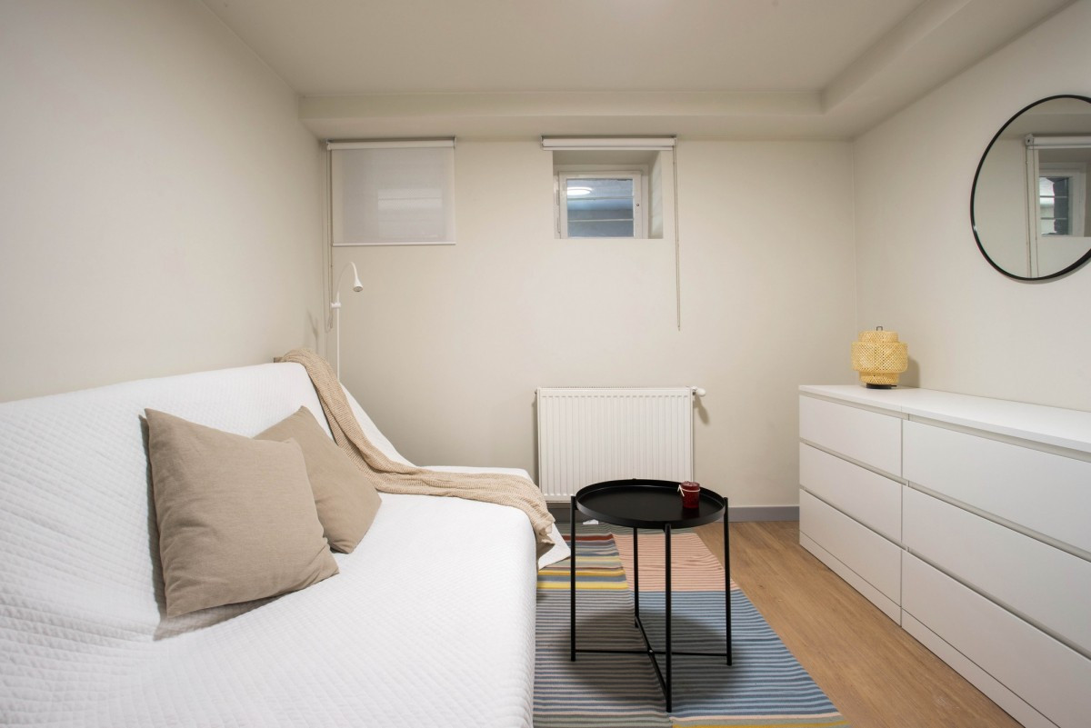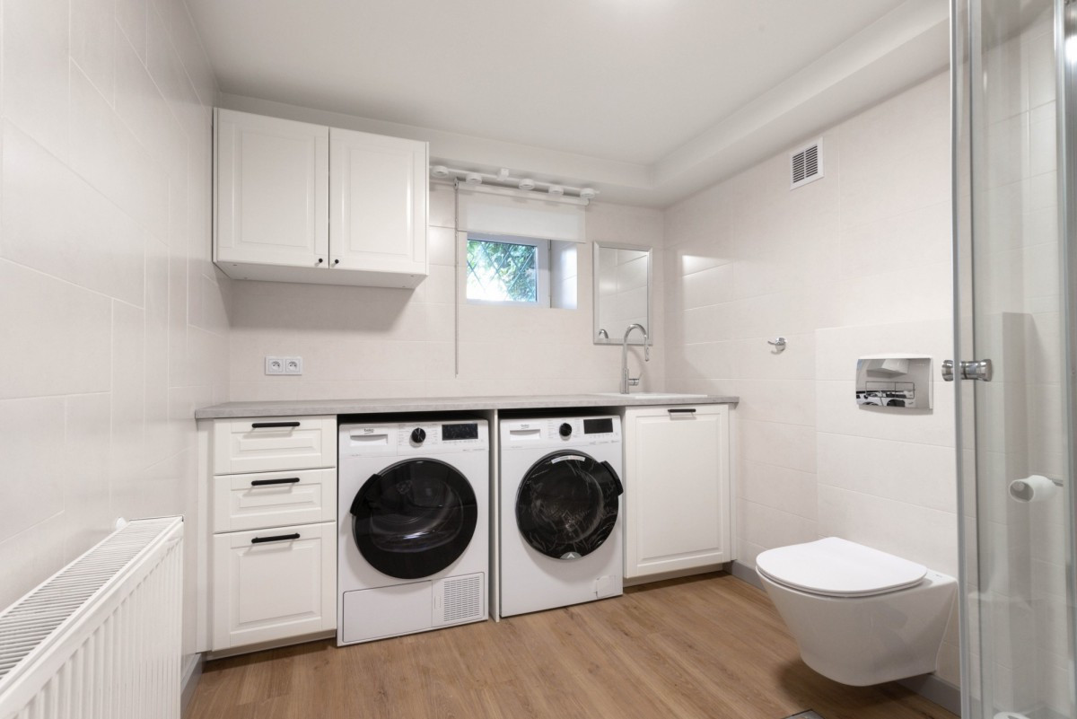 Poziom -1 to dodatkowy pokój z kanapą, pralnia z suszarnią i toaletą, schowek na sprzęt do ogródka.