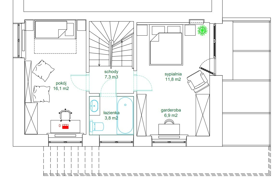 Kondygnacja 2 składa się z dwóch sypialni (większej i mniejszej), łazienki z wanną. Duża sypialnia ma dostęp do balkonu.