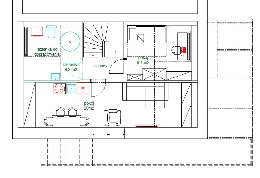 Na kondygnacji 1 mieści się salon, jadania z aneksem kuchennym, toaleta, przedpokój, nowy ogród zimowy oraz taras, z którego możemy wyjść na zadbany ogródek.