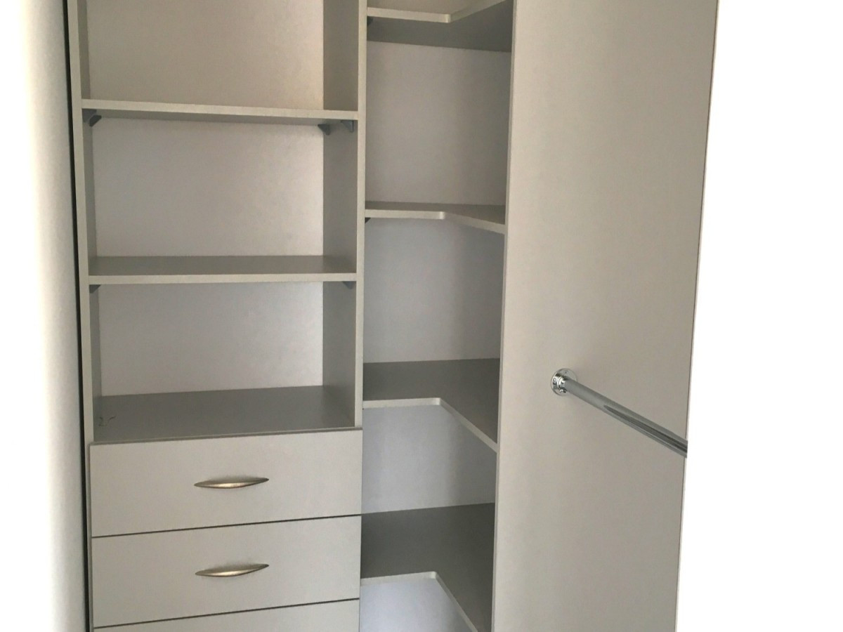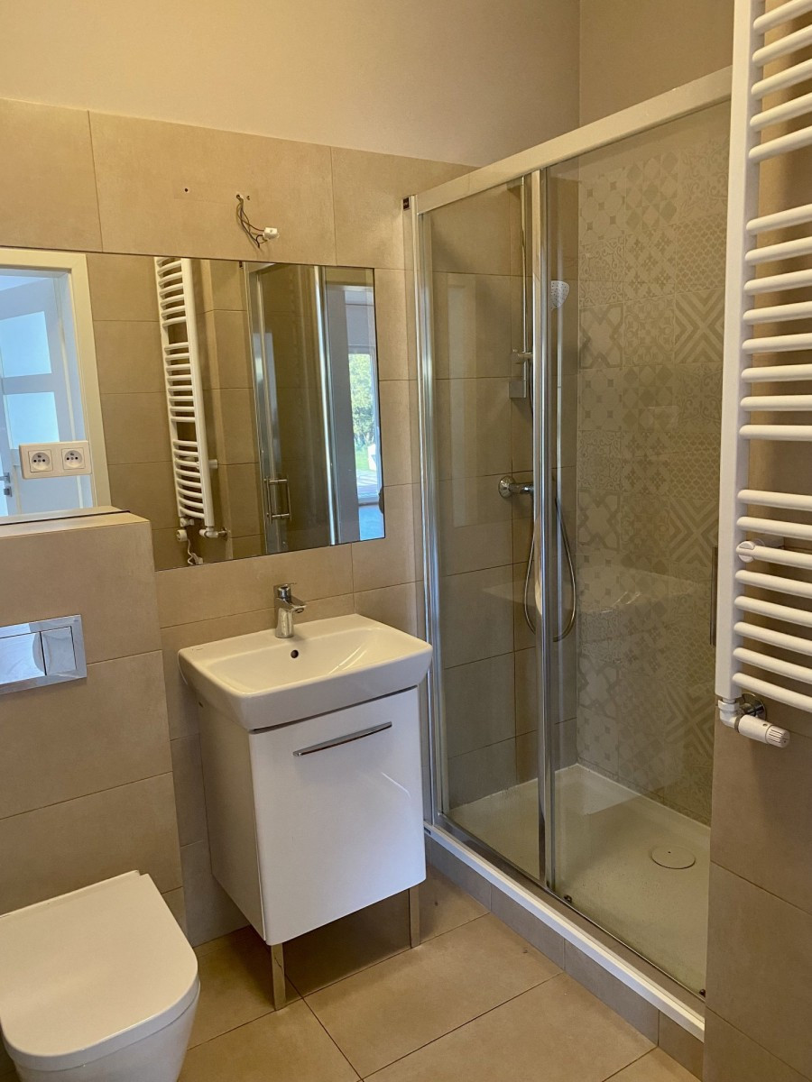 • łazienka z dużą kabiną prysznicową i pakowną szafą.