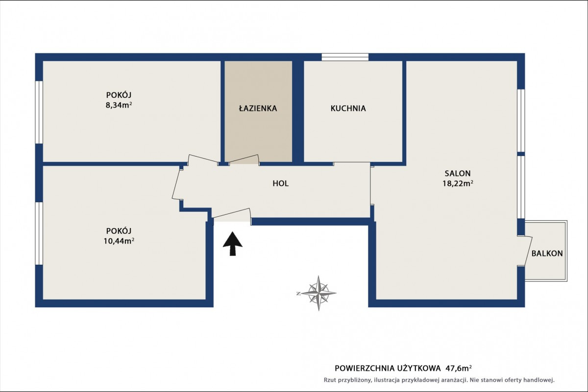 Po jednej stronie są dwie sypialnie, naprzeciw wejścia łazienka a po przeciwnej stronie mieszkania znajduje się salon z wyjściem na na balkon i kuchnia częściowo otwarta na salon.