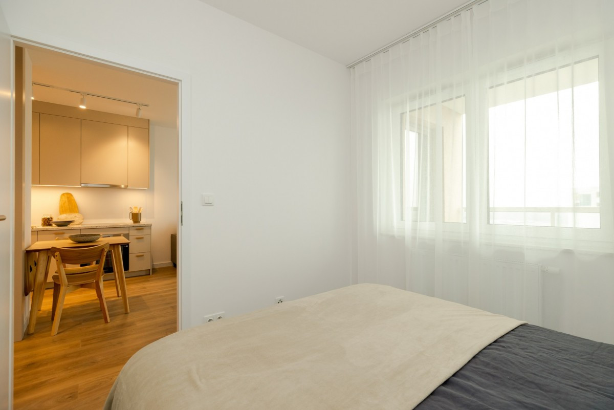 Mieszkanie jest bardzo dobrze doświetlone dzięki dużym oknom oraz położeniu na ósmym piętrze, a przemyślane rozmieszczenie zabudowy zapewnia komfort i funkcjonalność.