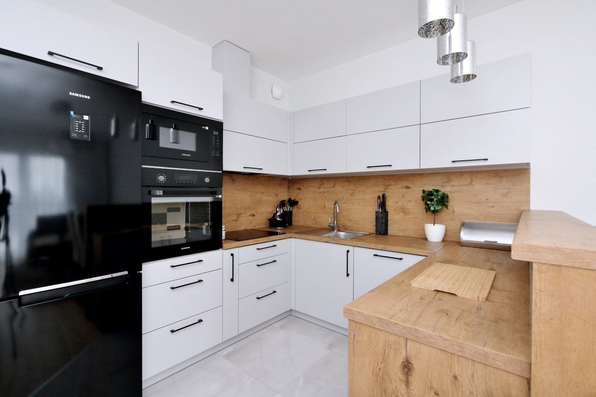 - zmywarka, duża lodówka z systemem No Frost, płyta indukcyjna, mikrofalówka w zabudowie, piekarnik,