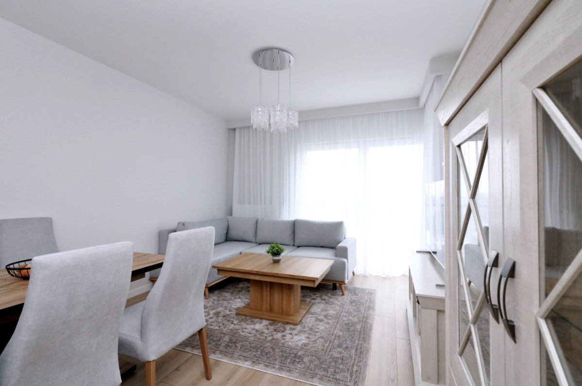 - duża rozkładana kanapa, stół z kompletem krzeseł, nowy telewizor