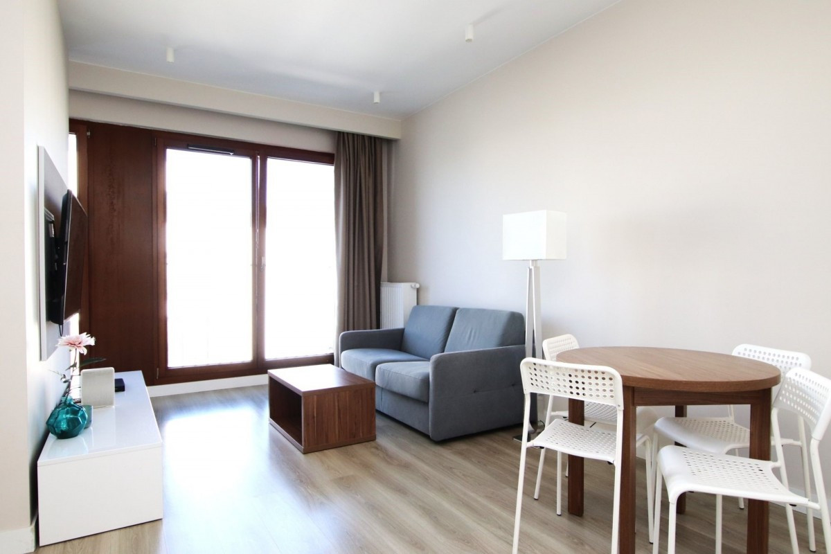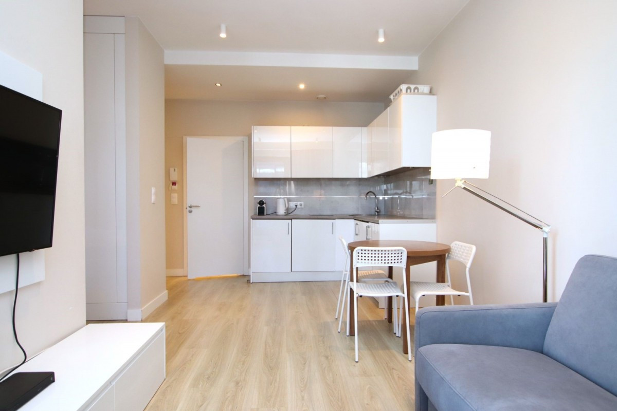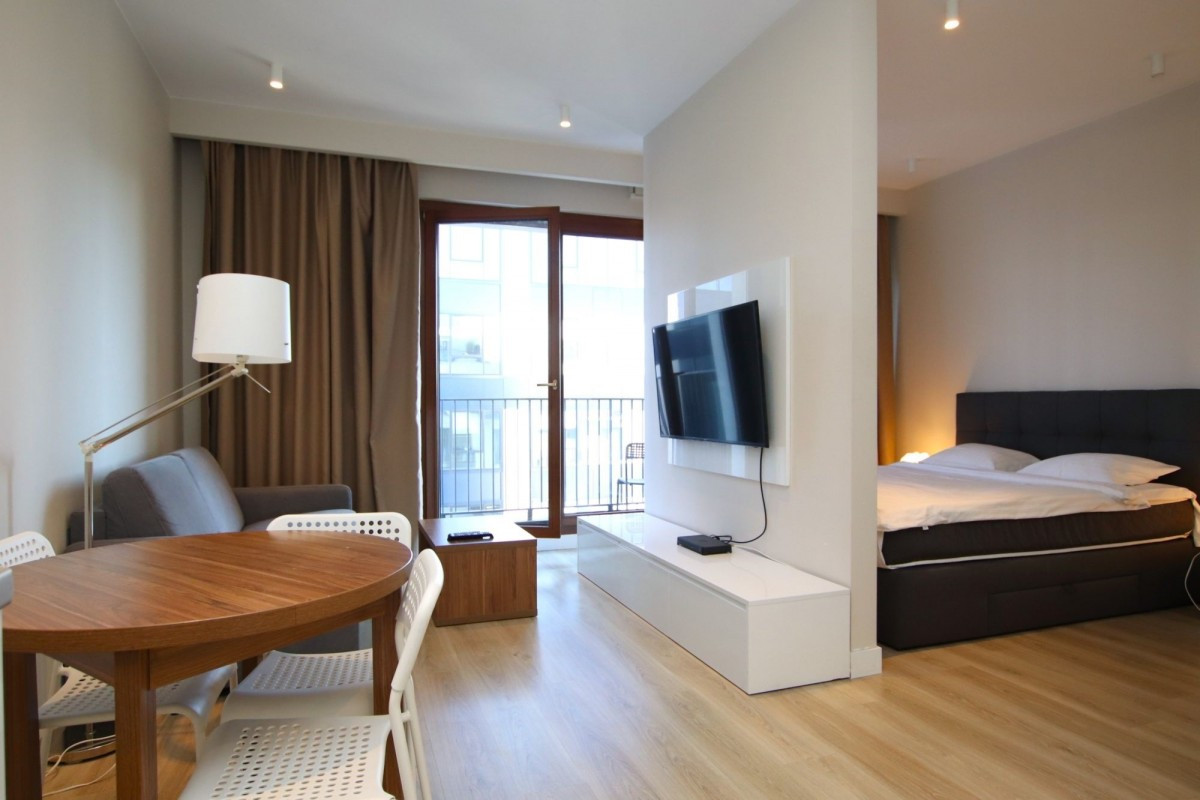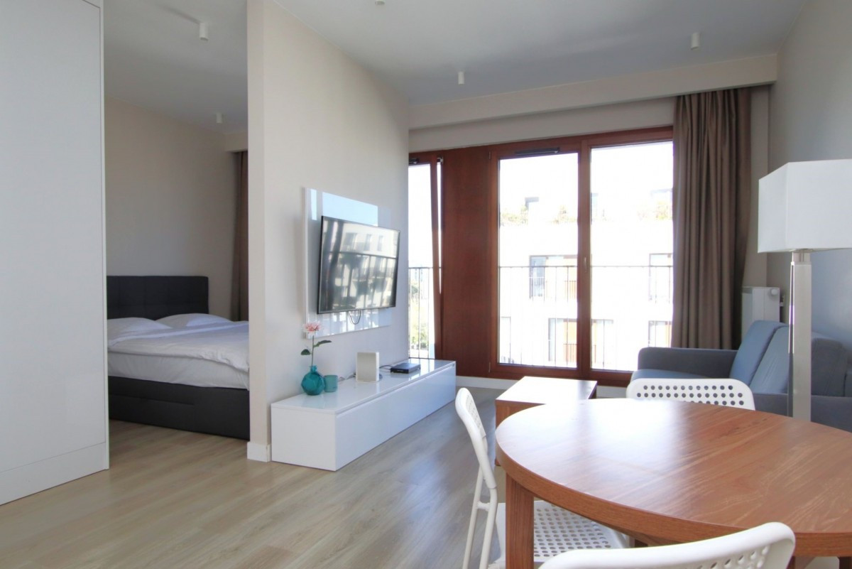 salon z aneksem kuchennym i wydzieloną sypialnią,