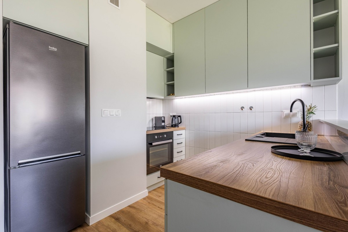 - stosunkowo duży salon, połączony z doskonale wkomponowanym w pełni wyposażonym, ergonomicznym aneksem kuchennym, w części tej znajduje się również wyjście na taras 10 m2 i niewielki ogródek około 50 m2