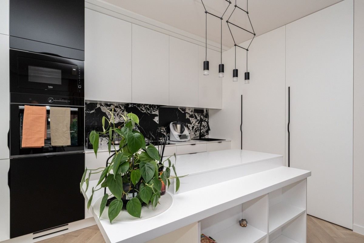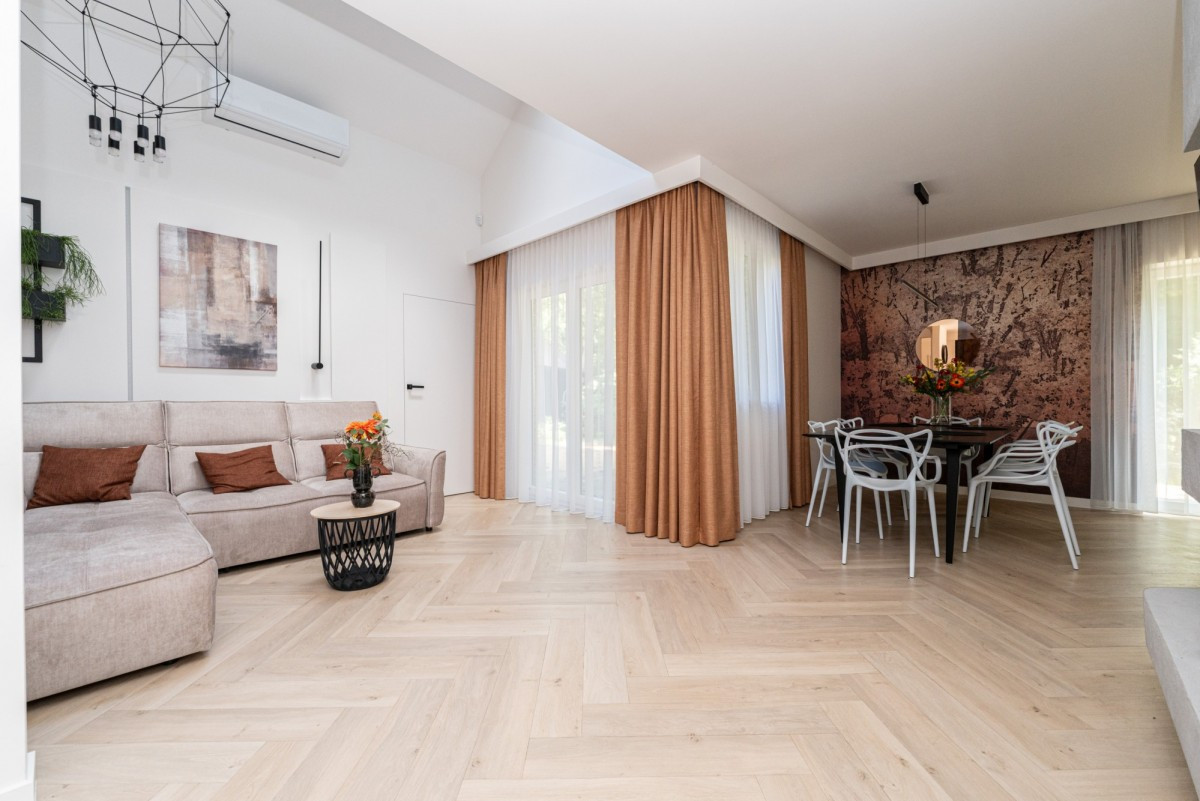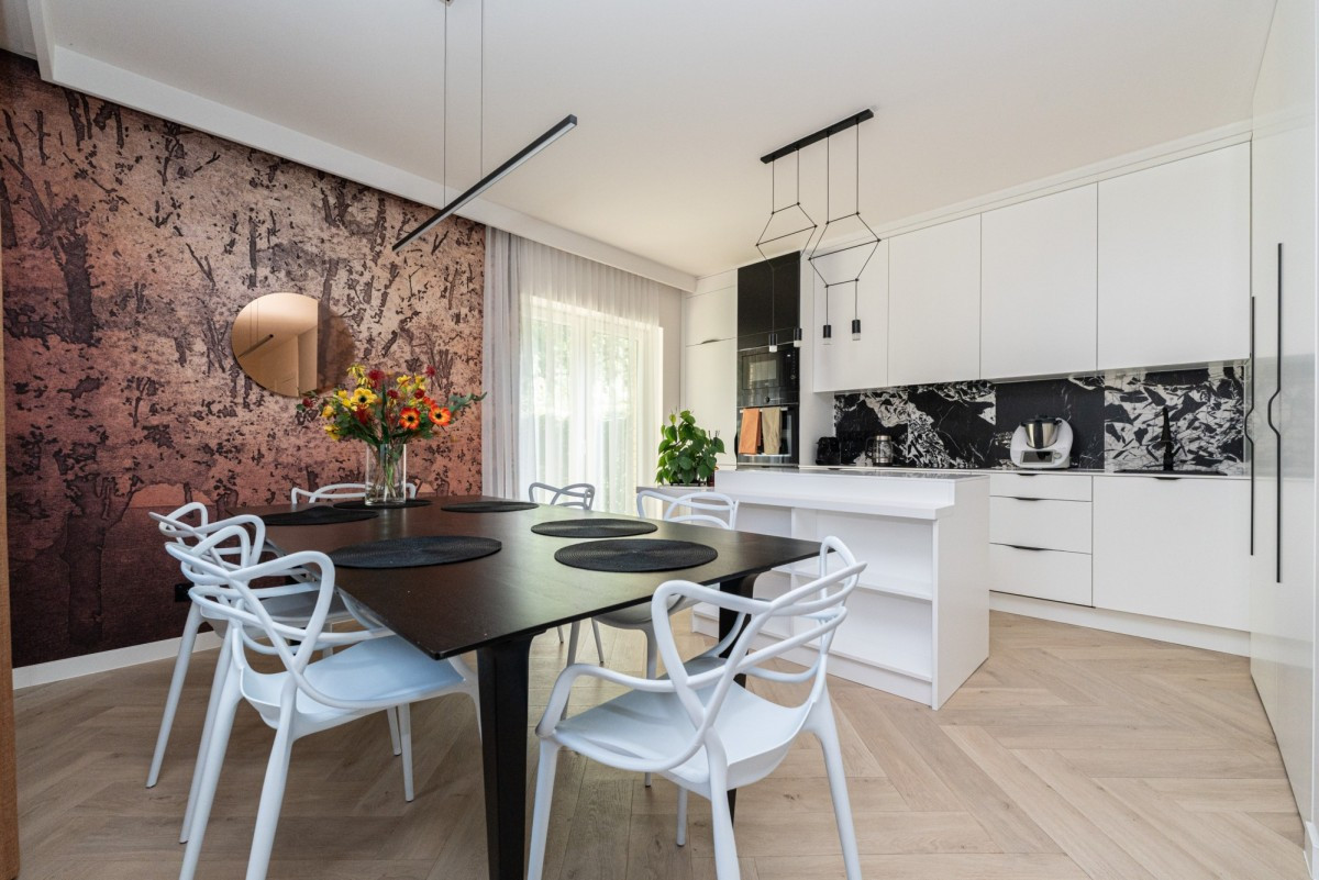 Salon i hol tworzą łącznie niemal 20-metrową przestrzeń. Jadalnia (ok. 8,5m2) jest połączona z kuchnią (ok. 8,7m2) z funkcjonalną wyspą. W kuchni znajduje się też ukryta spiżarnia (ok. 2,5m2) z mnóstwem miejsca do przechowywania. Na parterze znajduje się również gabinet, czy też pokój gościnny (ok. 12m2) z rozkładaną kanapą, biurkiem oraz prywatną łazienką z prysznicem, WC i umywalką.