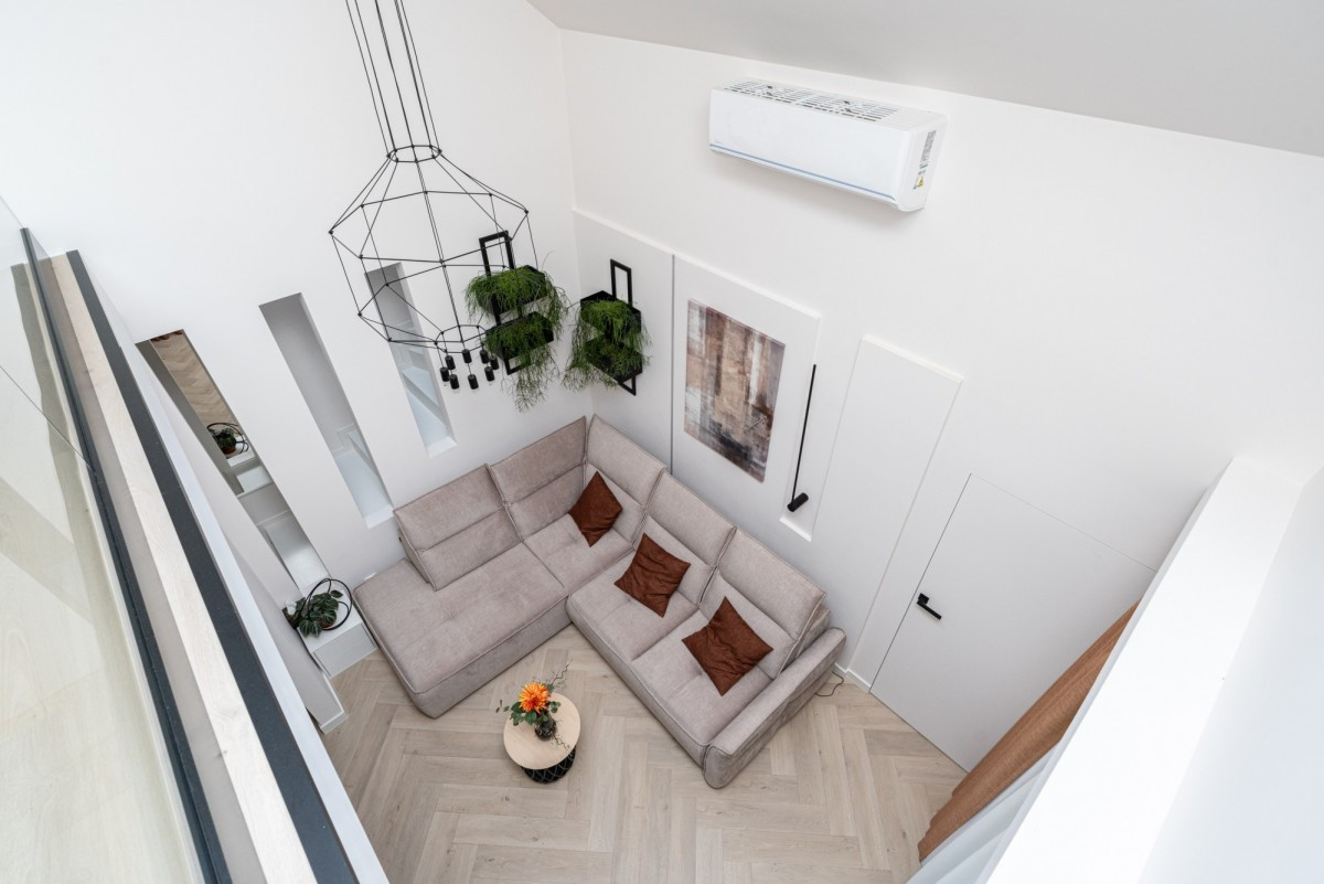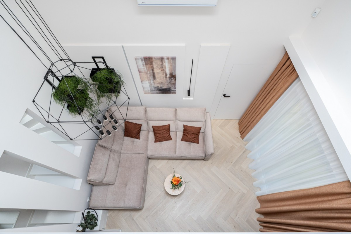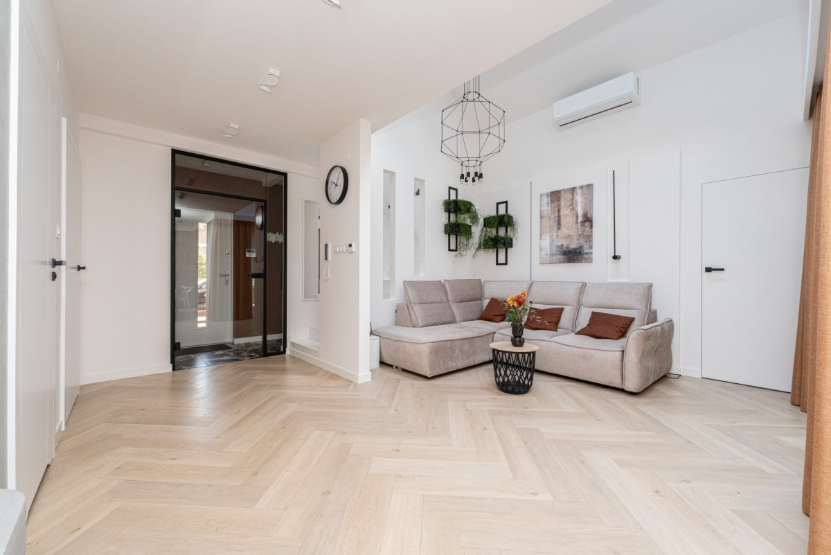 Do nieruchomości wchodzi się przez ponad 3 metrowym przedpokój z ukrytą za lustrzaną ścianą przestrzenią do przechowywania i połączony z resztą domu eleganckim przeszkleniem. Sufit w salonie ma w najwyższym punkcie ponad 5 metrów wysokości dzięki antresoli ze szklaną balustradą, a okno połaciowe zapewnia optymalne doświetlenie.