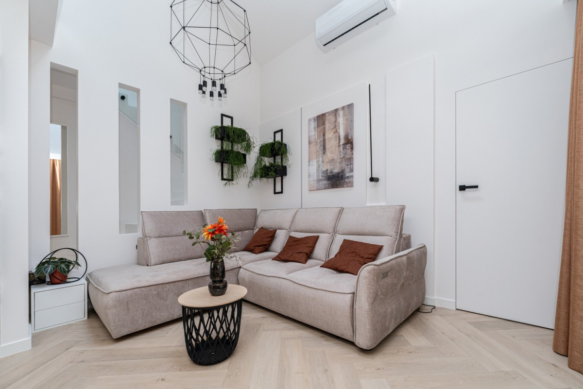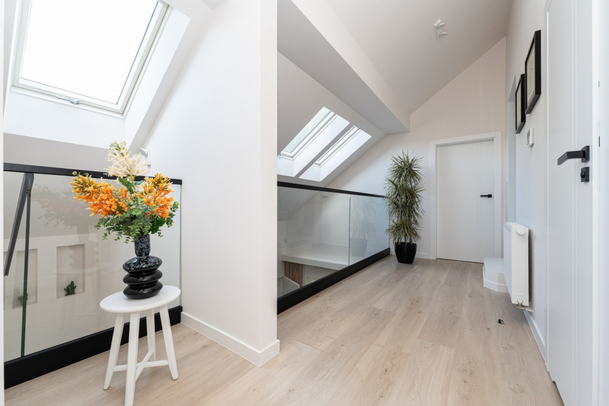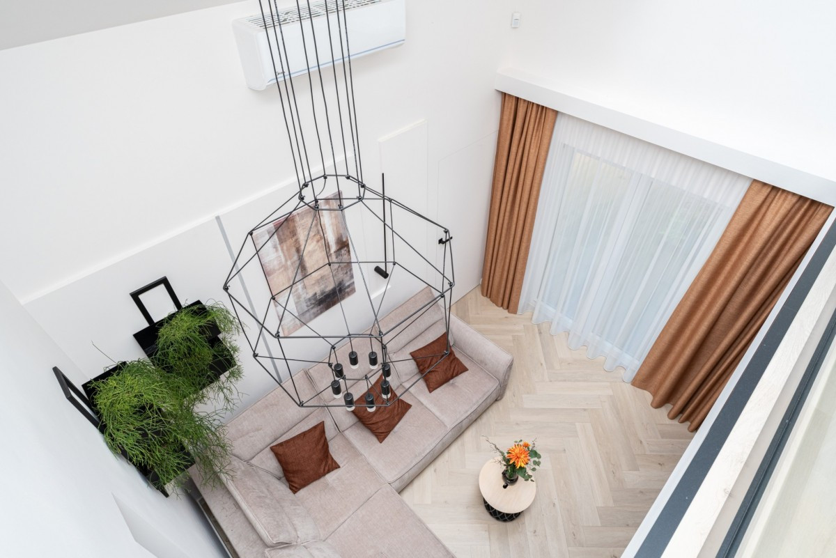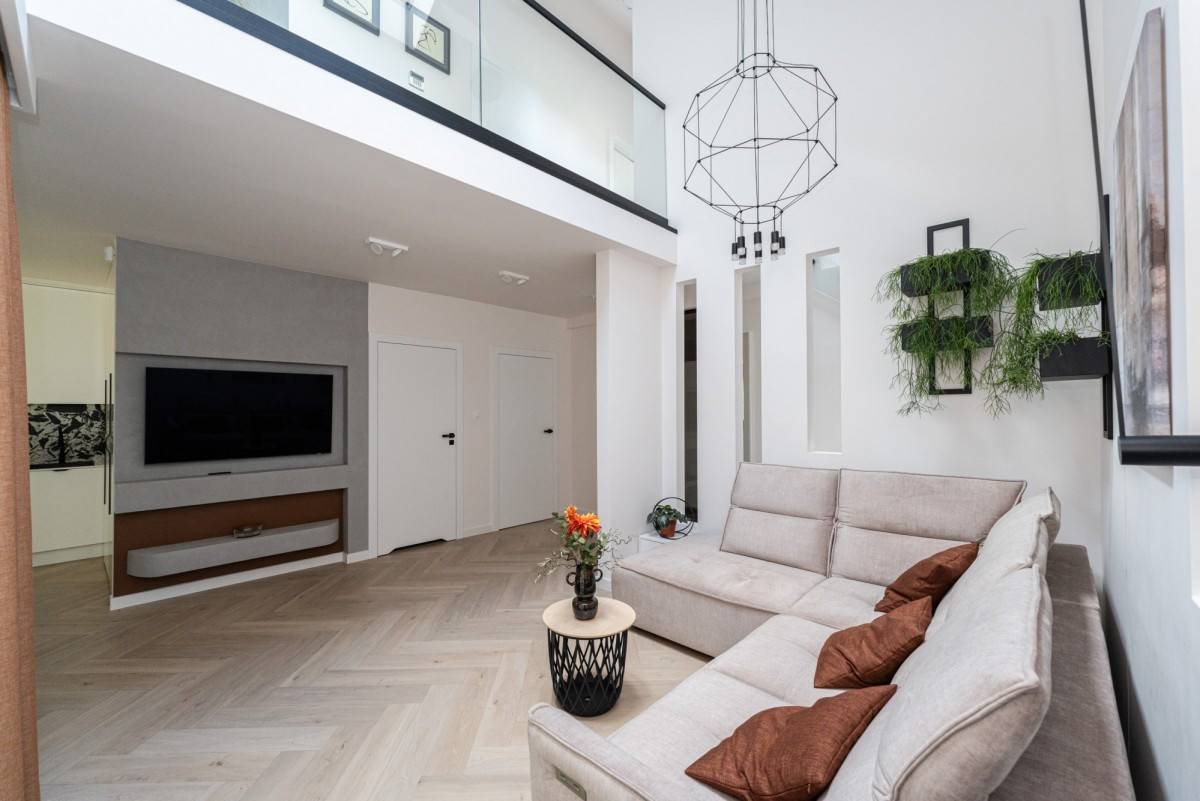 Do nieruchomości wchodzi się przez ponad 3 metrowym przedpokój z ukrytą za lustrzaną ścianą przestrzenią do przechowywania i połączony z resztą domu eleganckim przeszkleniem. Sufit w salonie ma w najwyższym punkcie ponad 5 metrów wysokości dzięki antresoli ze szklaną balustradą, a okno połaciowe zapewnia optymalne doświetlenie.