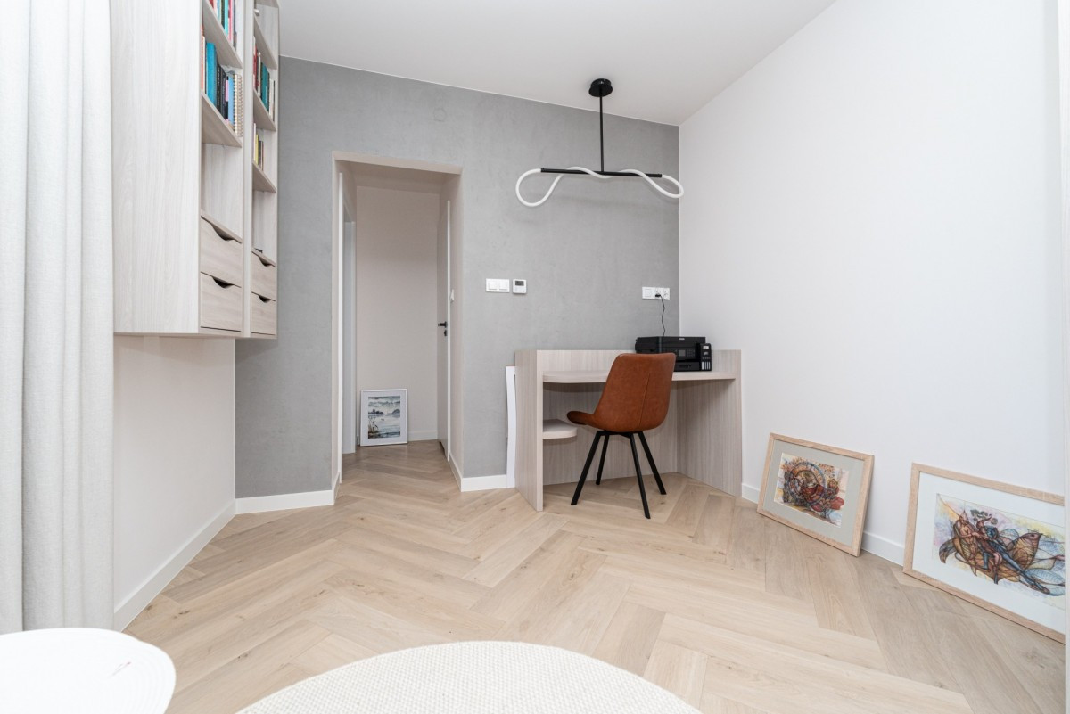 W drugim, niewielkim pokoju można urządzić pokoik lub bawialnię dla dziecka, nieduży gabinet lub schowek.