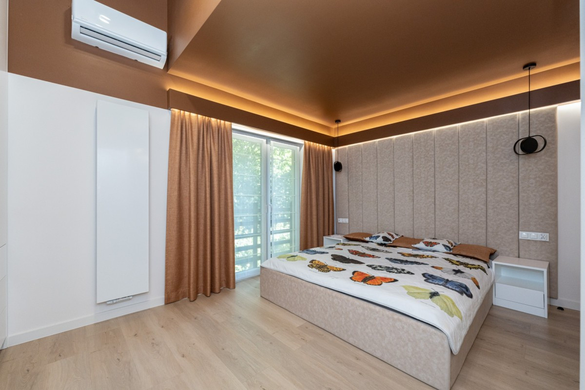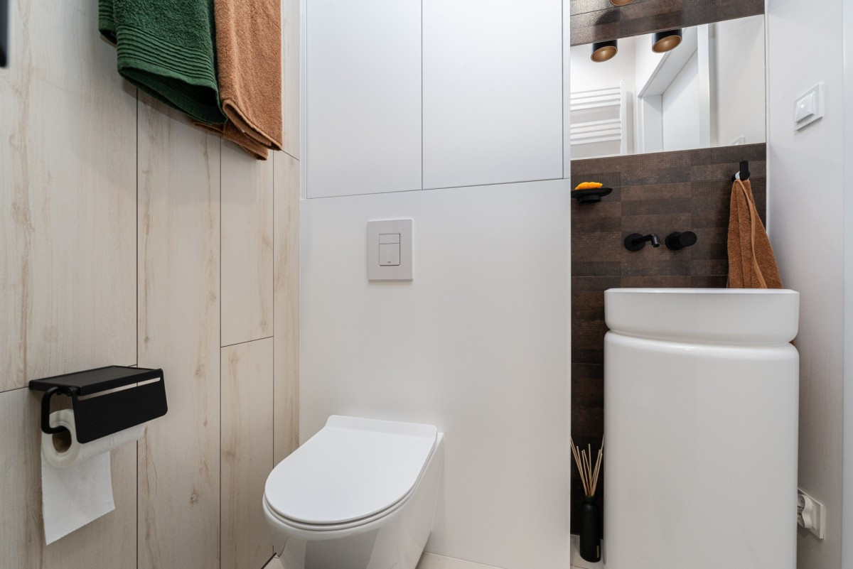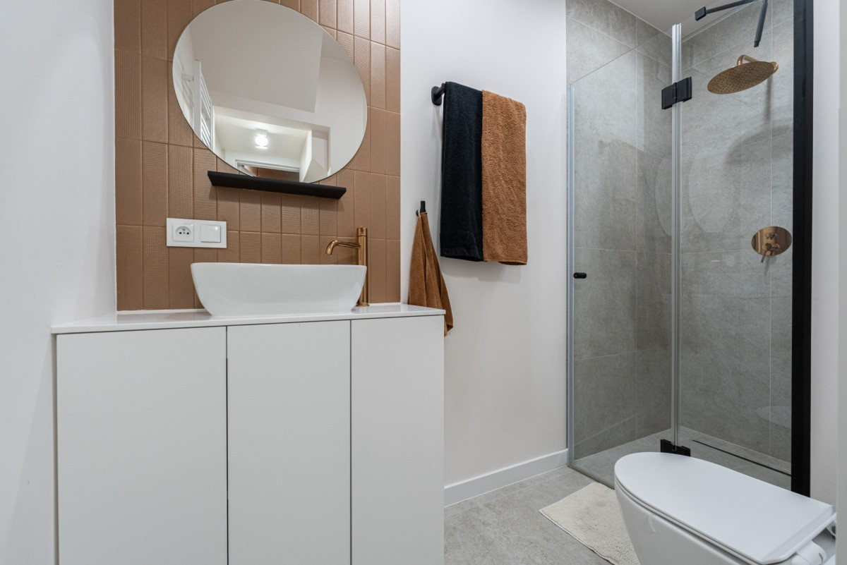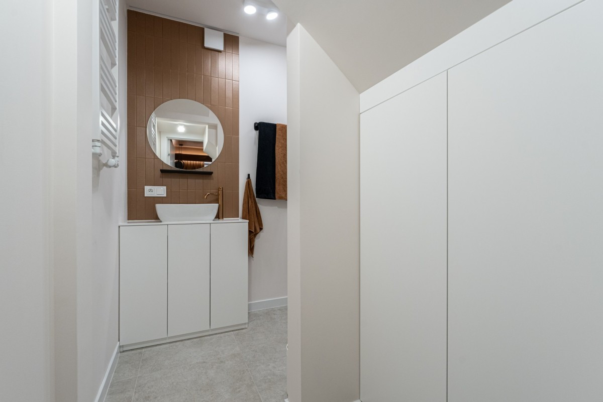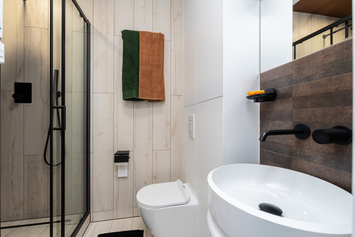 Sypialnia jest połączona z łazienką z prysznicem, WC, umywalką i schowkiem.