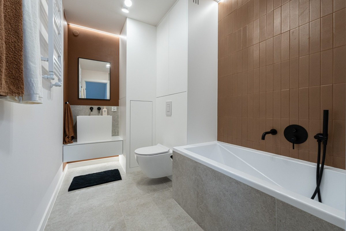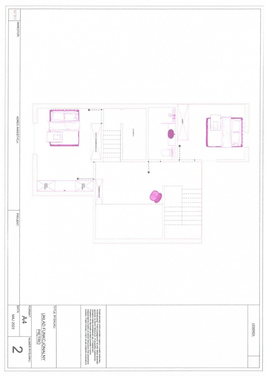 Na tym poziomie znajduje się jeszcze jedna łazienka z wejściem z 10-metrowego przedpokoju, jest w niej wanna, umywalka i WC.