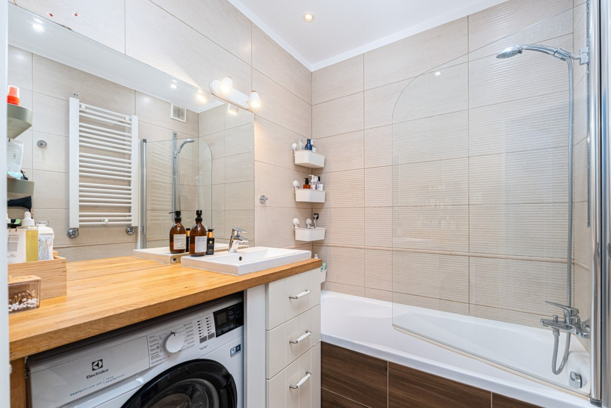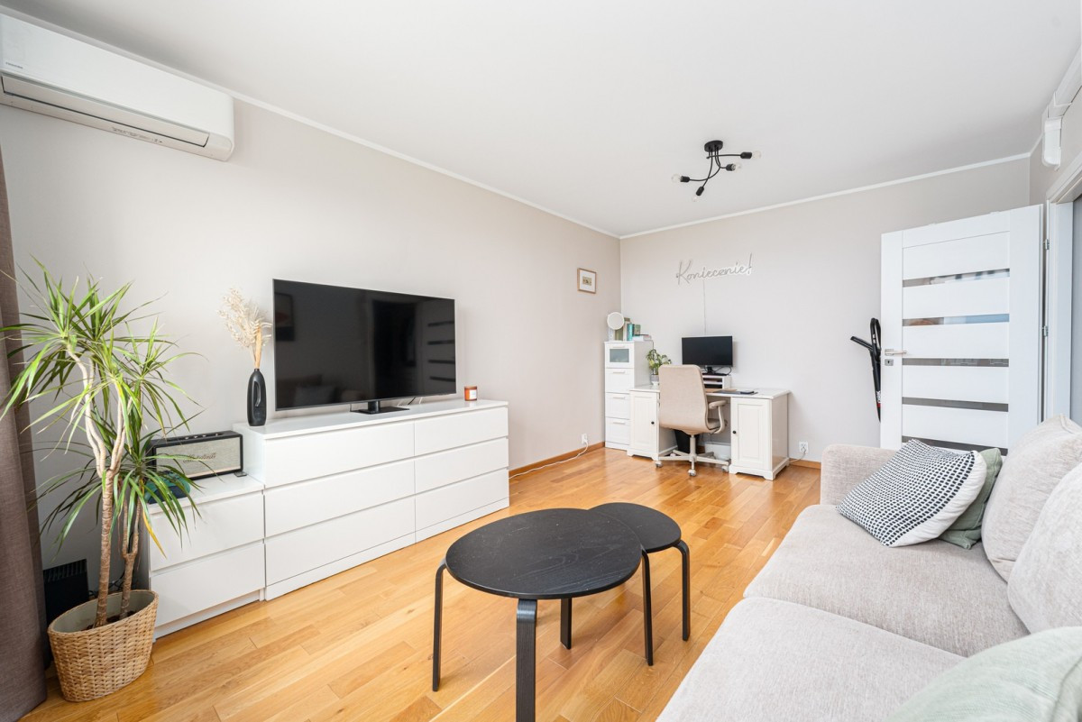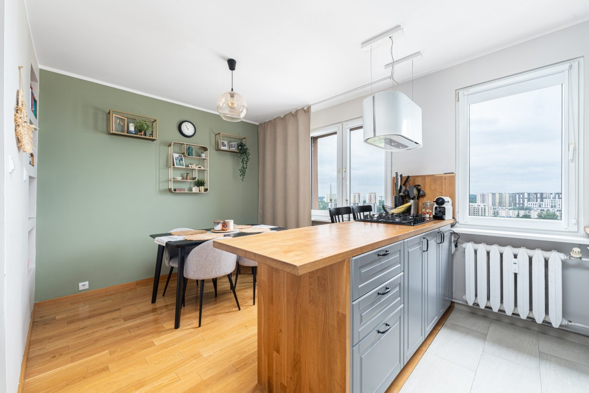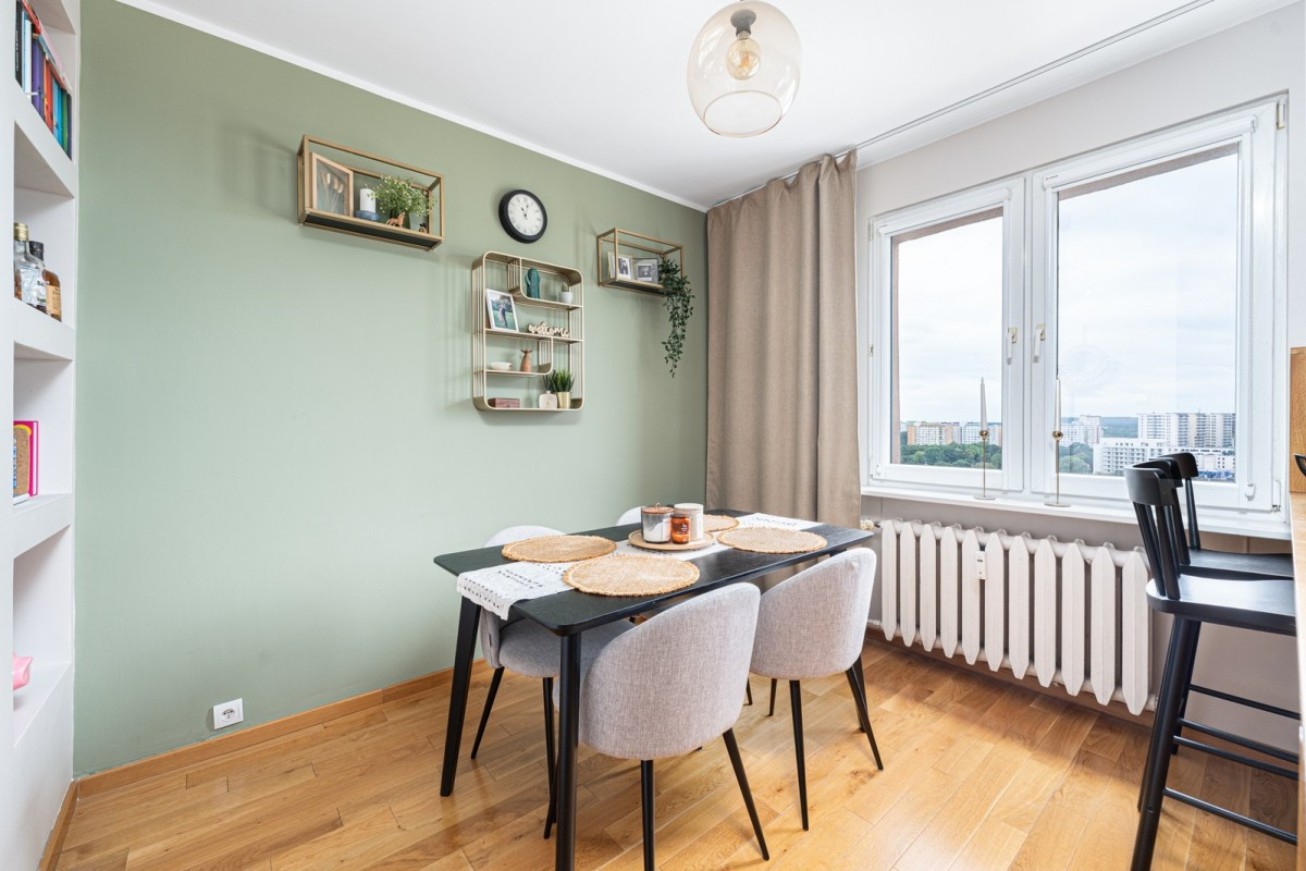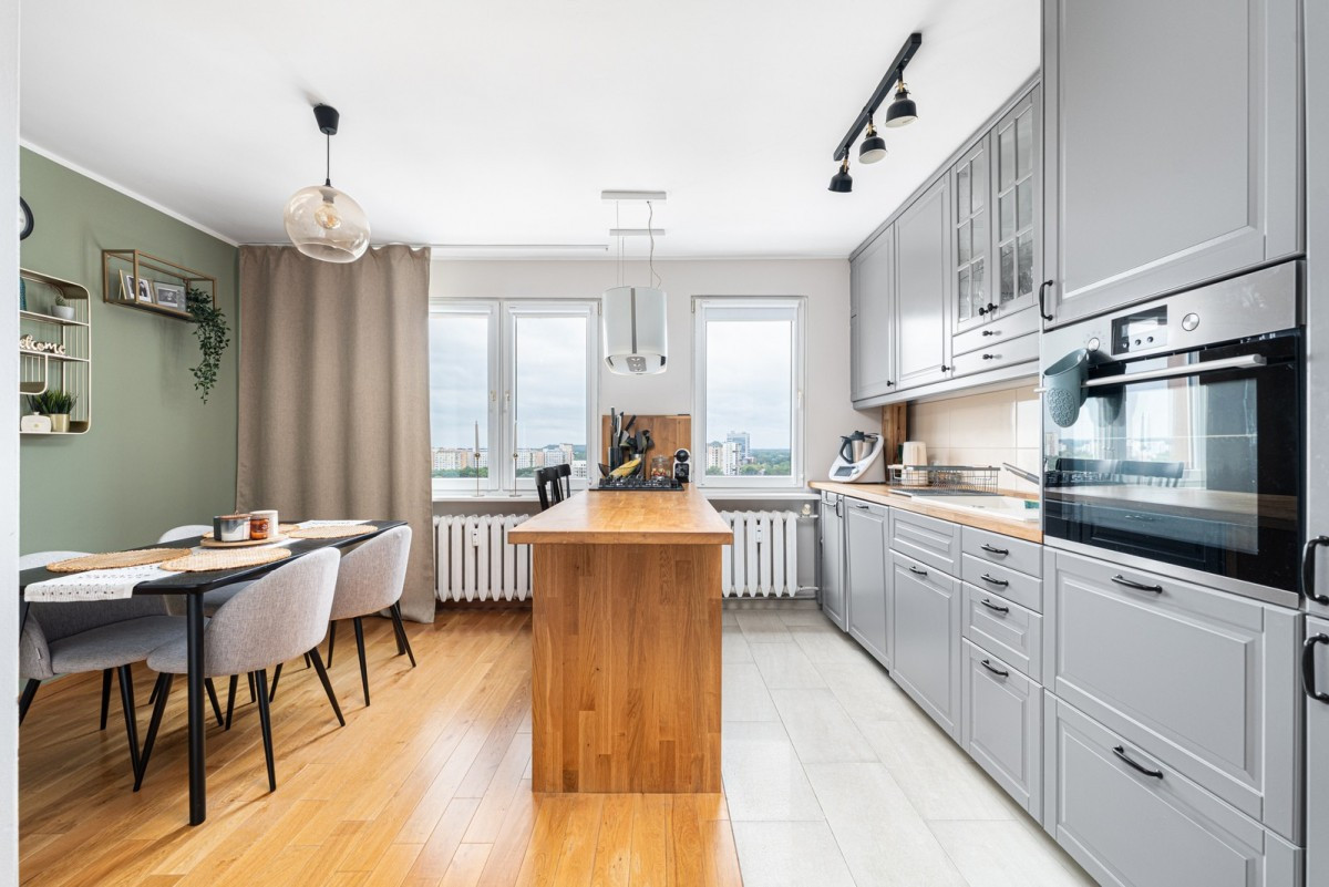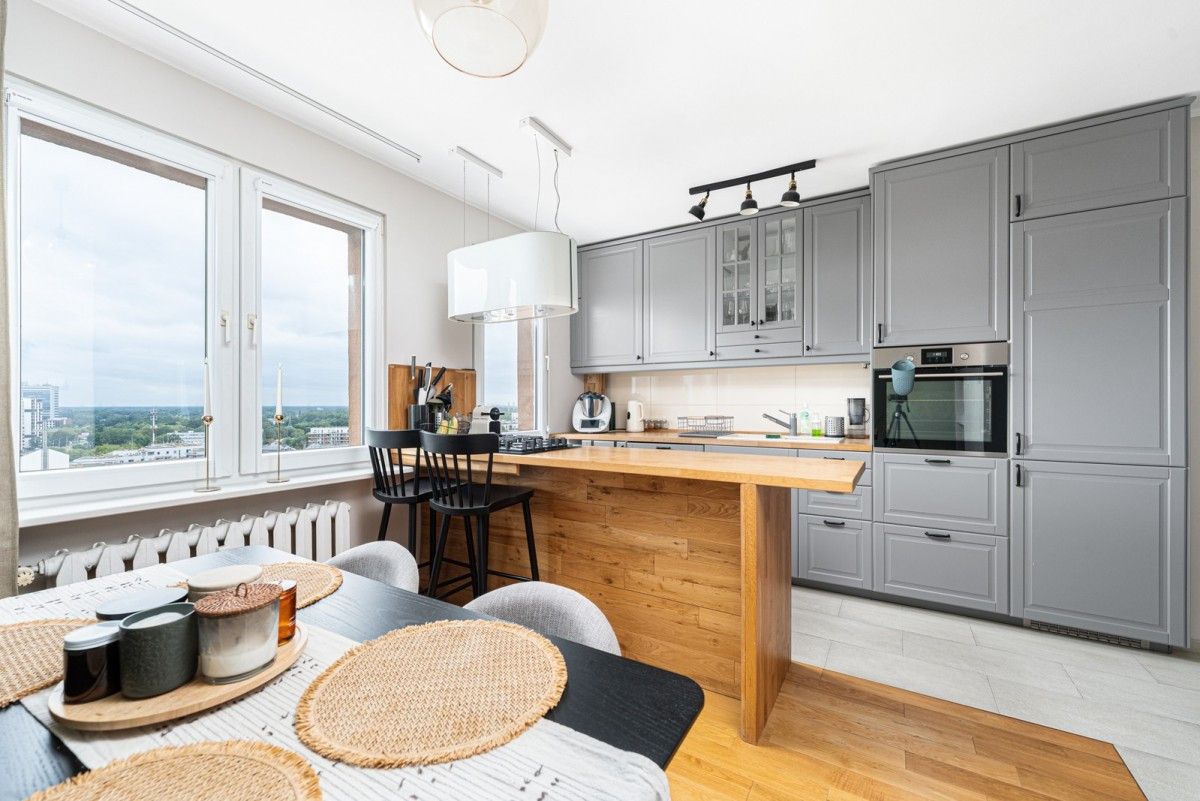 Mieszkanie bardzo zadbane, ze wspaniałym widokiem z okien. 7 lat temu przeszło kapitalny remont zgodnie z wizją projektanta wnętrz. 3 lata temu założono klimatyzację, a 2 lata temu odmalowano ściany zmywalną farbą (Beckers). Na podłogach deska barlinecka i płytki sprowadzone z Hiszpanii. Duża kuchnia z półwyspem kuchennym i mnóstwem miejsca do przechowywania tworzy razem z jadalnią funkcjonalną przestrzeń dzienną, ale również idealne miejsce do spotkań towarzyskich.
