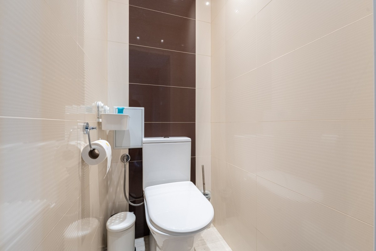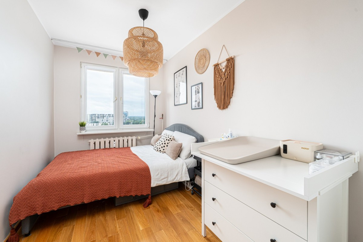 Przytulna sypialnia ma ok. 9m2 powierzchni, a salon (mogący również pełnić funkcję drugiej sypialni) ma ok. 16m2, znajduje się w nim kanapa, biurko, TV i duże, wykonane na zamówienie okno oraz wyjście na balkon. Łazienka (wanna, umywalka, grzejnik drabinkowy, pralka) ma ok. 3m2, a osobna toaleta - ok. 1m2. W przedpokoju stoi pojemna szafa wnękowa.