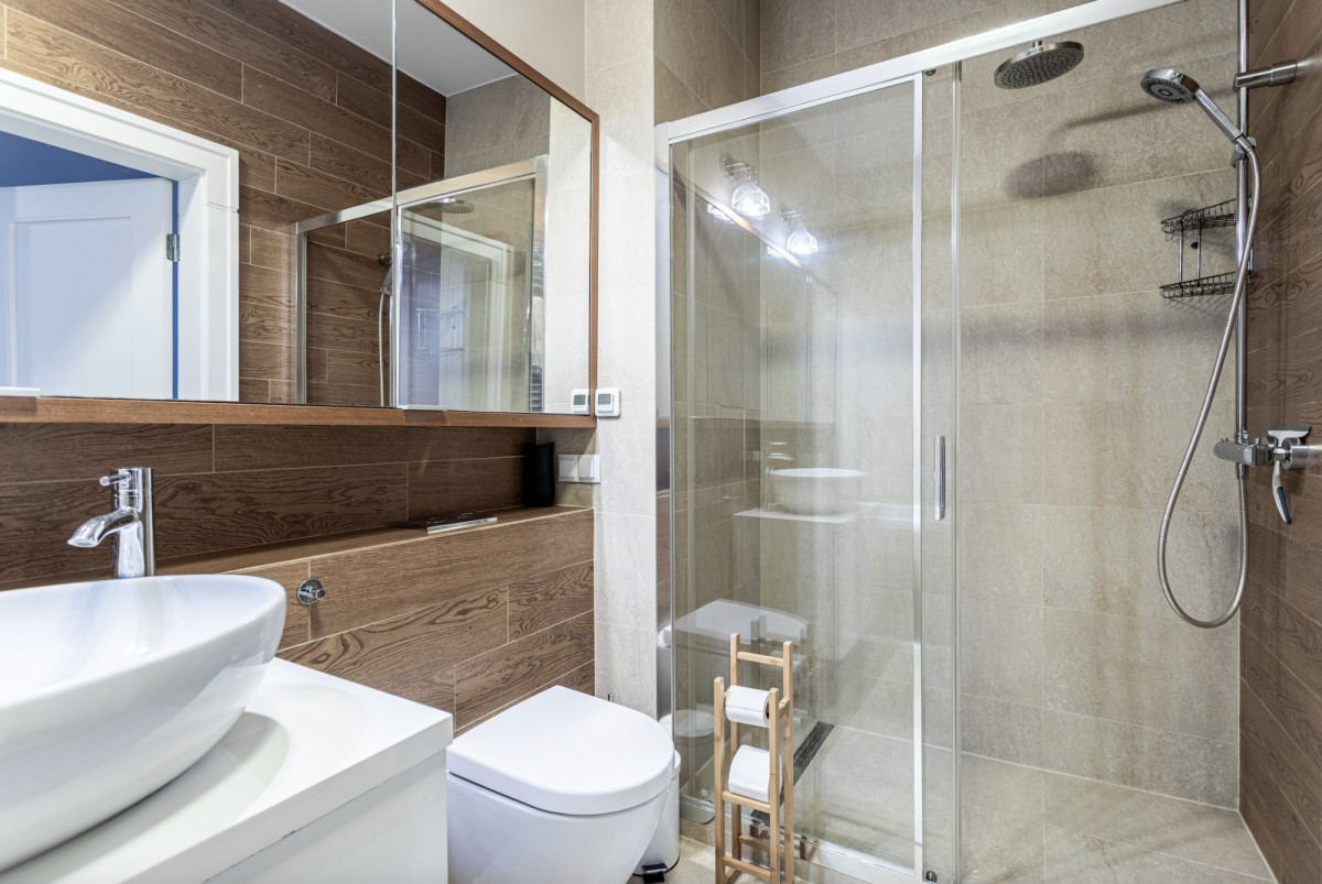 • a bathroom with both a bathtub and a shower, plus a separate toilet.