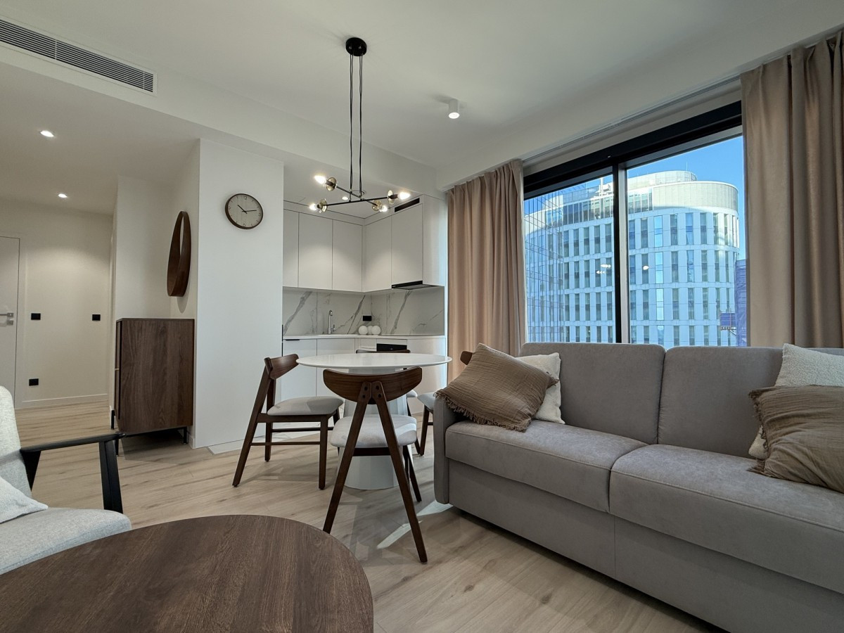 Ten nowoczesny apartament o powierzchni ok 46 m², zaprojektowany przez architekta, składa się z przestronnego salonu z aneksem kuchennym (w pełni wyposażonym w meble i sprzęt AGD), osobnej sypialni, łazienki z wanną oraz korytarza z zabudowaną szafą.