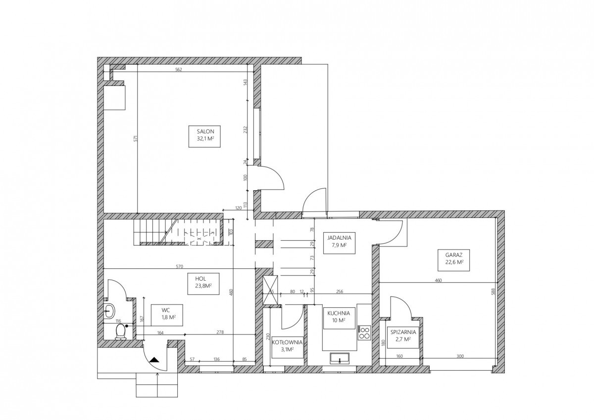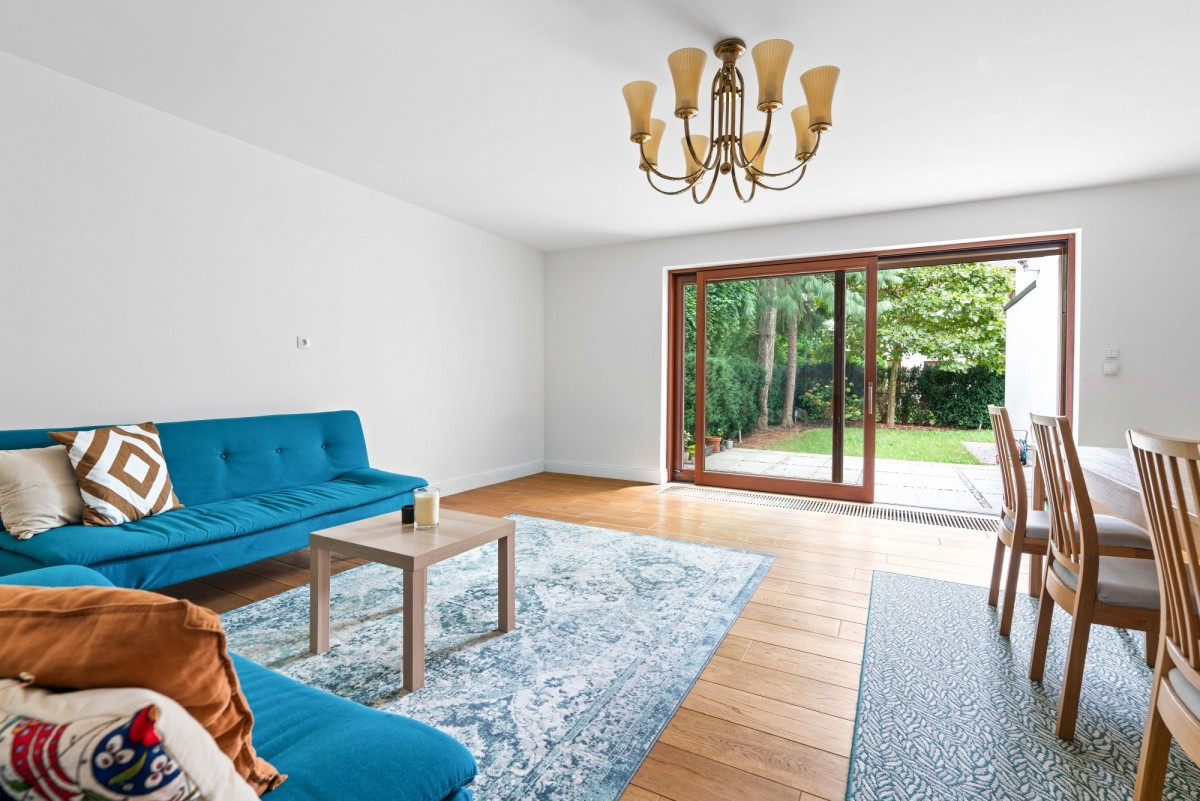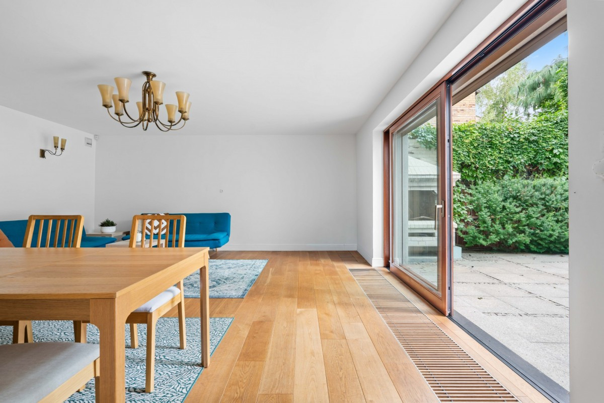 Przestronny salon (32 m²) z wyjściem na słoneczny, zachodni ogród.