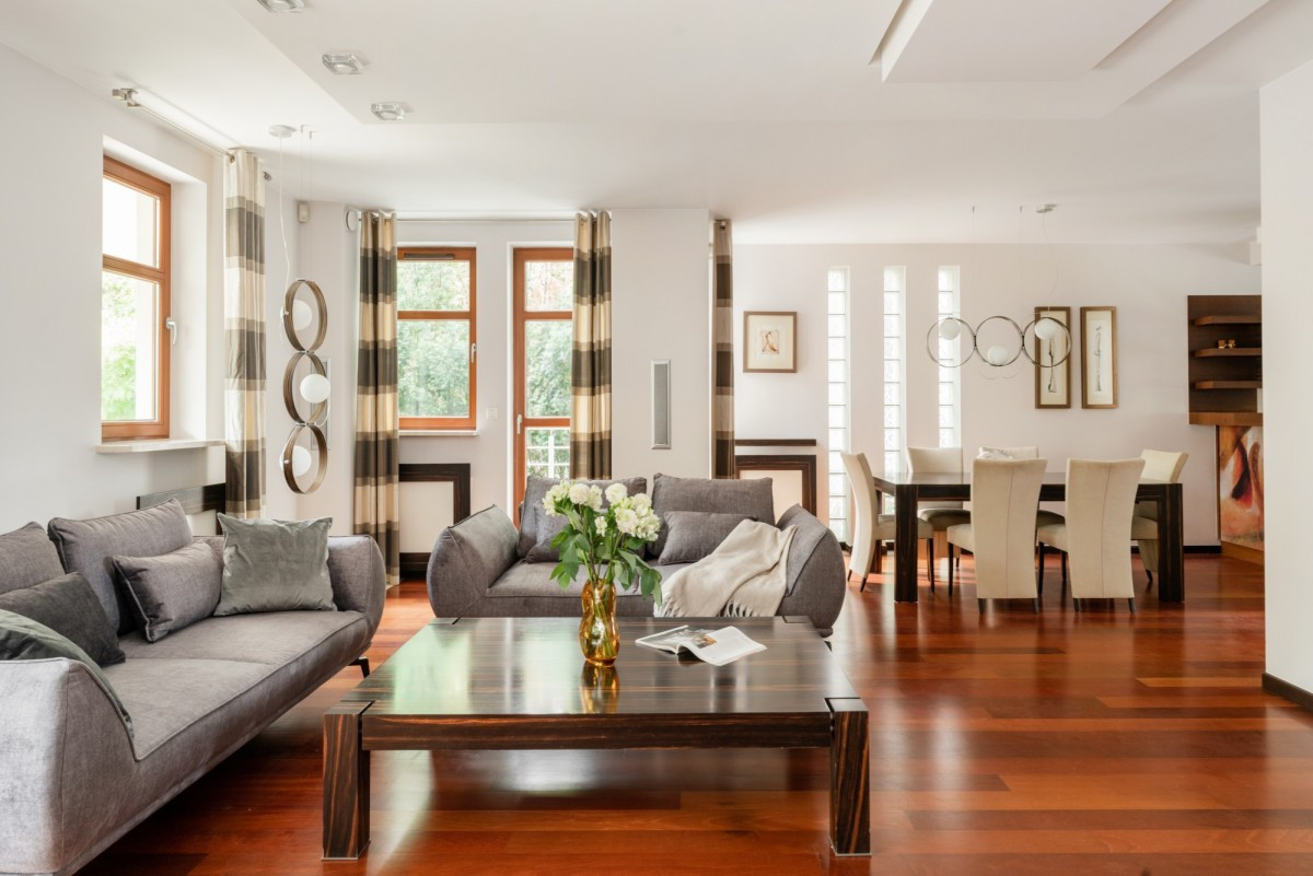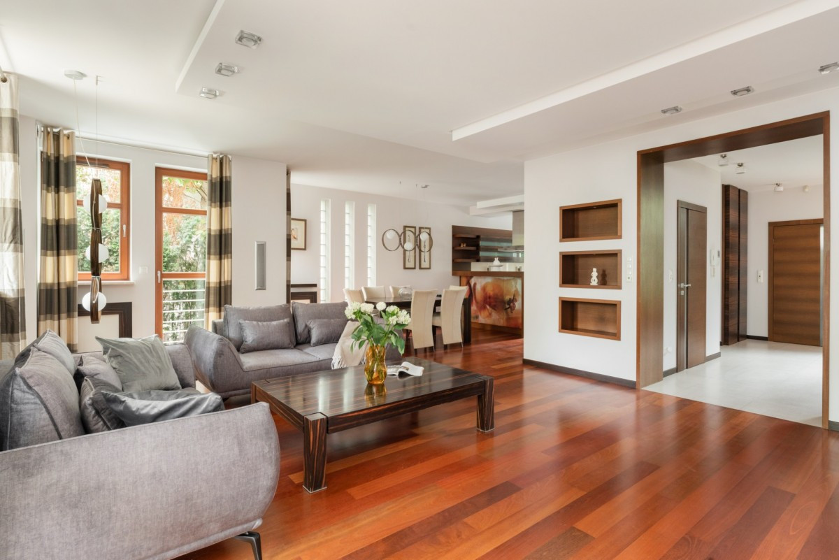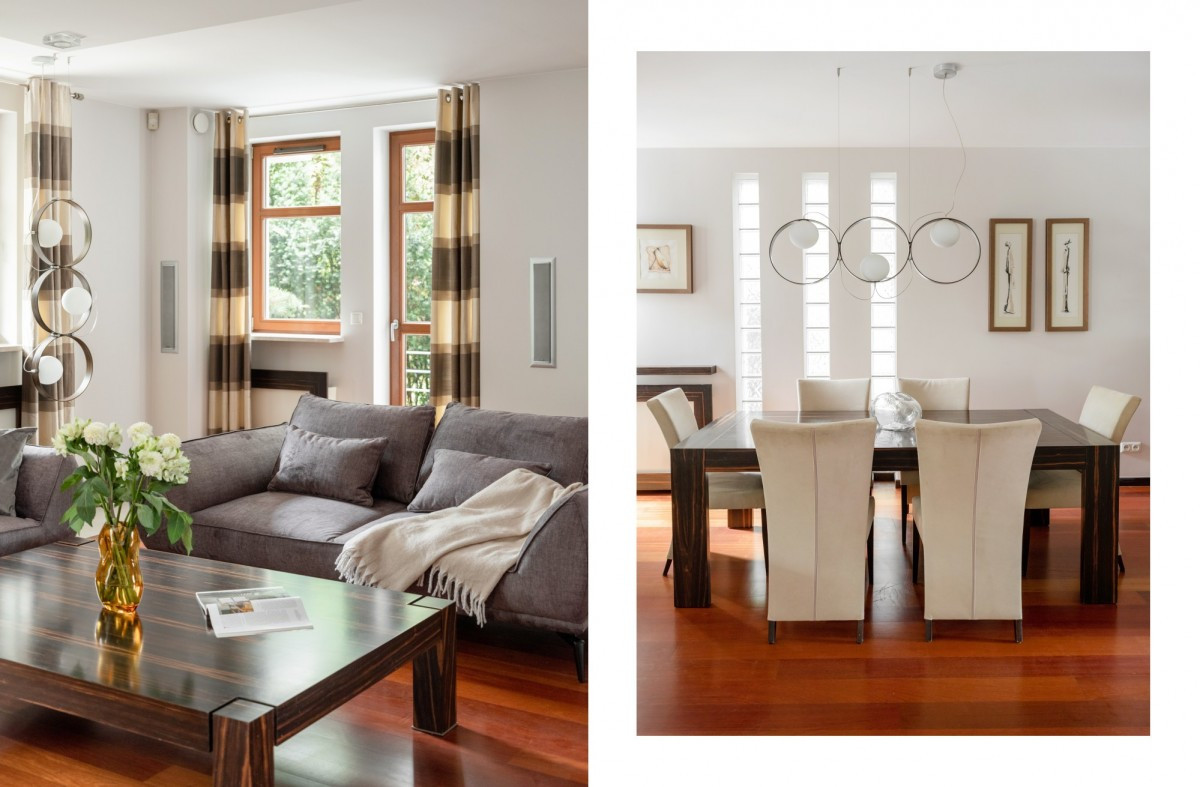 Salon wyposażony jest w nowe kanapy i nowy panoramiczny telewizor. Podłoga w salonie to egzotyczne drewno jatoba. W częściach gdzie położny jest gres mamy rozprowadzone ogrzewanie podłogowe.