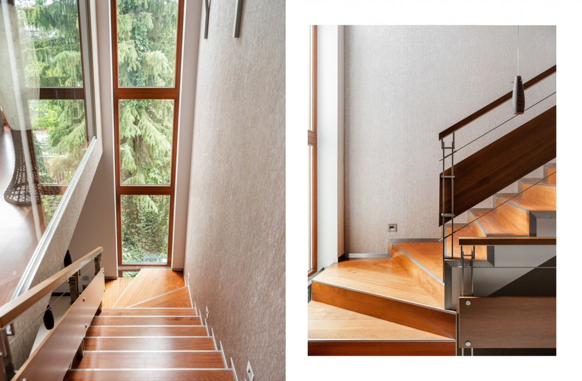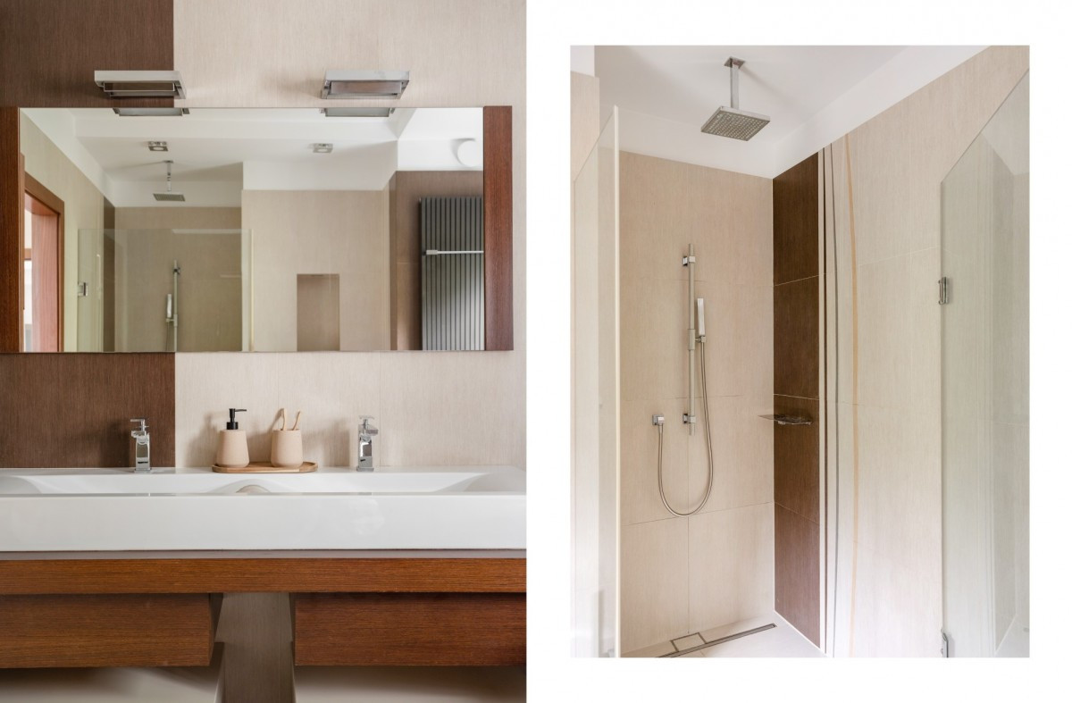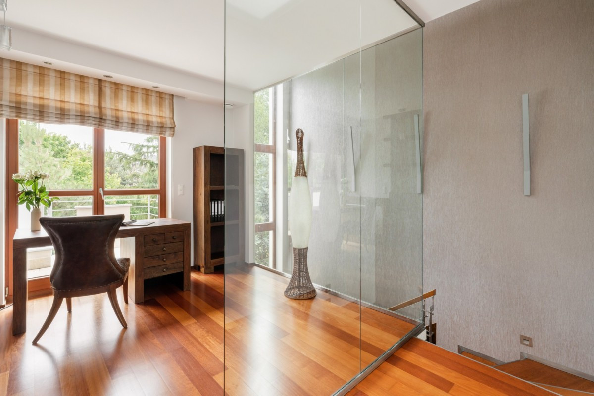 Na pierwszym piętrze mieszczą się dwie sypialnie w tym jedna typu master bedroom z osobną łazienką z wanną i prysznicem oraz garderobą, przeszklony gabinet z pięknym widokiem na zieleń , dodatkowa łazienka z wanną, prysznicem i luksferami.