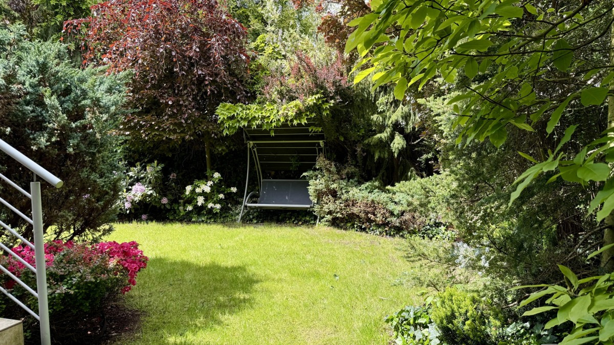 Parter nieruchomości to przestronna część dzienna: jasny salon z jadalnią oraz półotwartą kuchnią z oknem oddzielonym funkcjonalną konsolą barową, garderoba i toaleta gościnna. Z salonu mamy wyjście na zadbany ogród (330 m2) z tarasem z osobnym systemem podlewania ogrodowego.