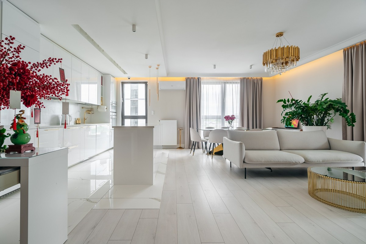 jasny salon z przestronnym aneksem kuchennym z oknami od strony wschodniej i południowej