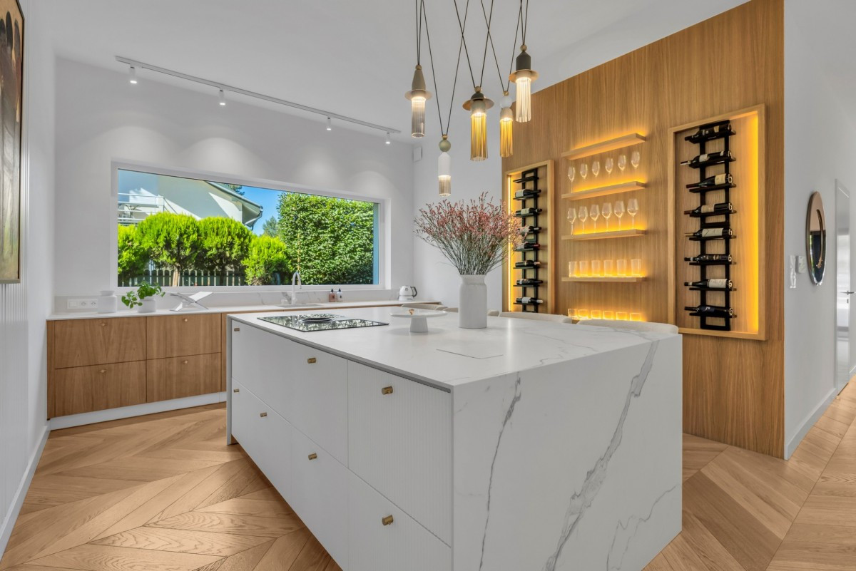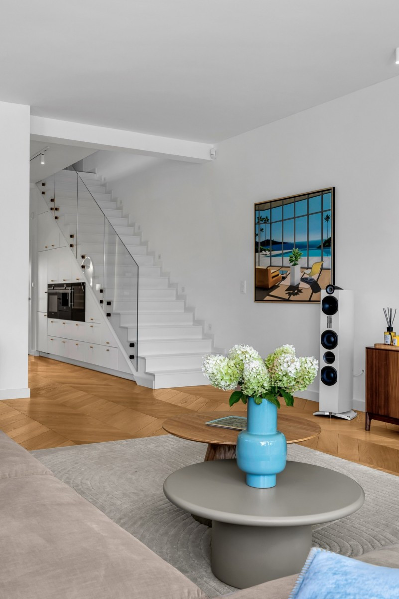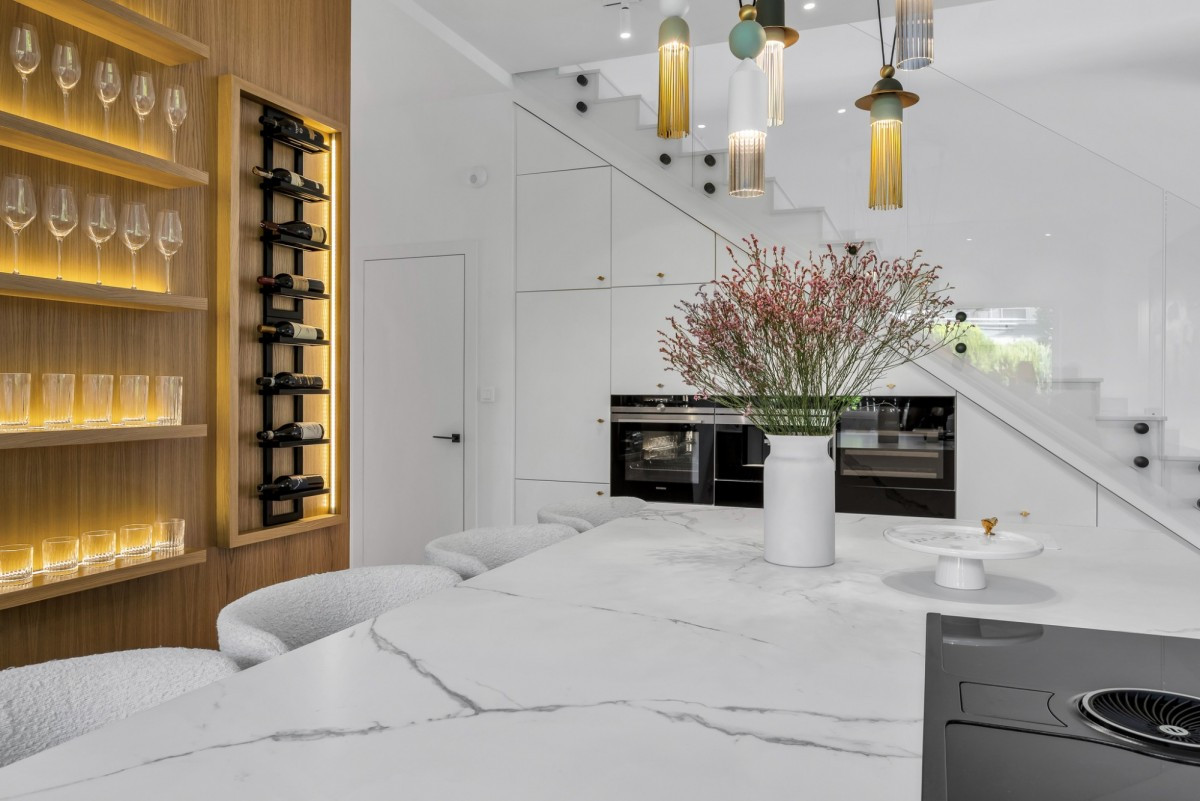 Dom wykończony został w bardzo wysokim standardzie, z użyciem materiałów i wyposażenia renomowanych marek. Projekt wnętrz to połączenie światowego designu z funkcjonalnym podejściem do przestrzeni - elegancko, nowocześnie, z przemyślanym układem i wyjątkową atmosferą.