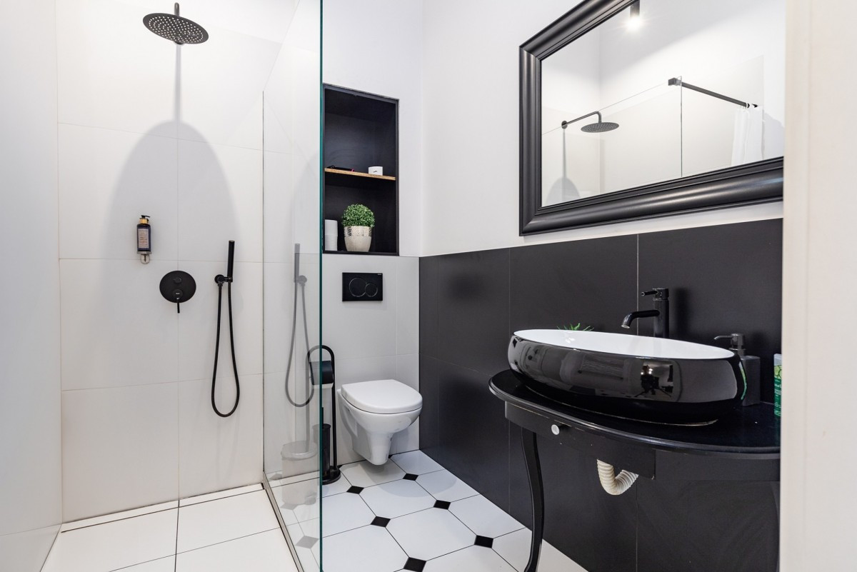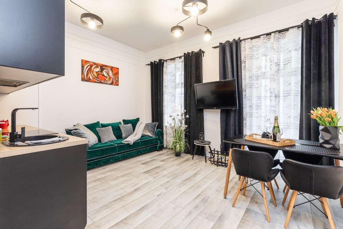 Tastefully furnished space with a total area of almost 35 m². It includes a hall with built-in wardrobe, a fully equipped living room with a kitchenette and exit to a balcony, a spacious bedroom, and a large bathroom with a shower.