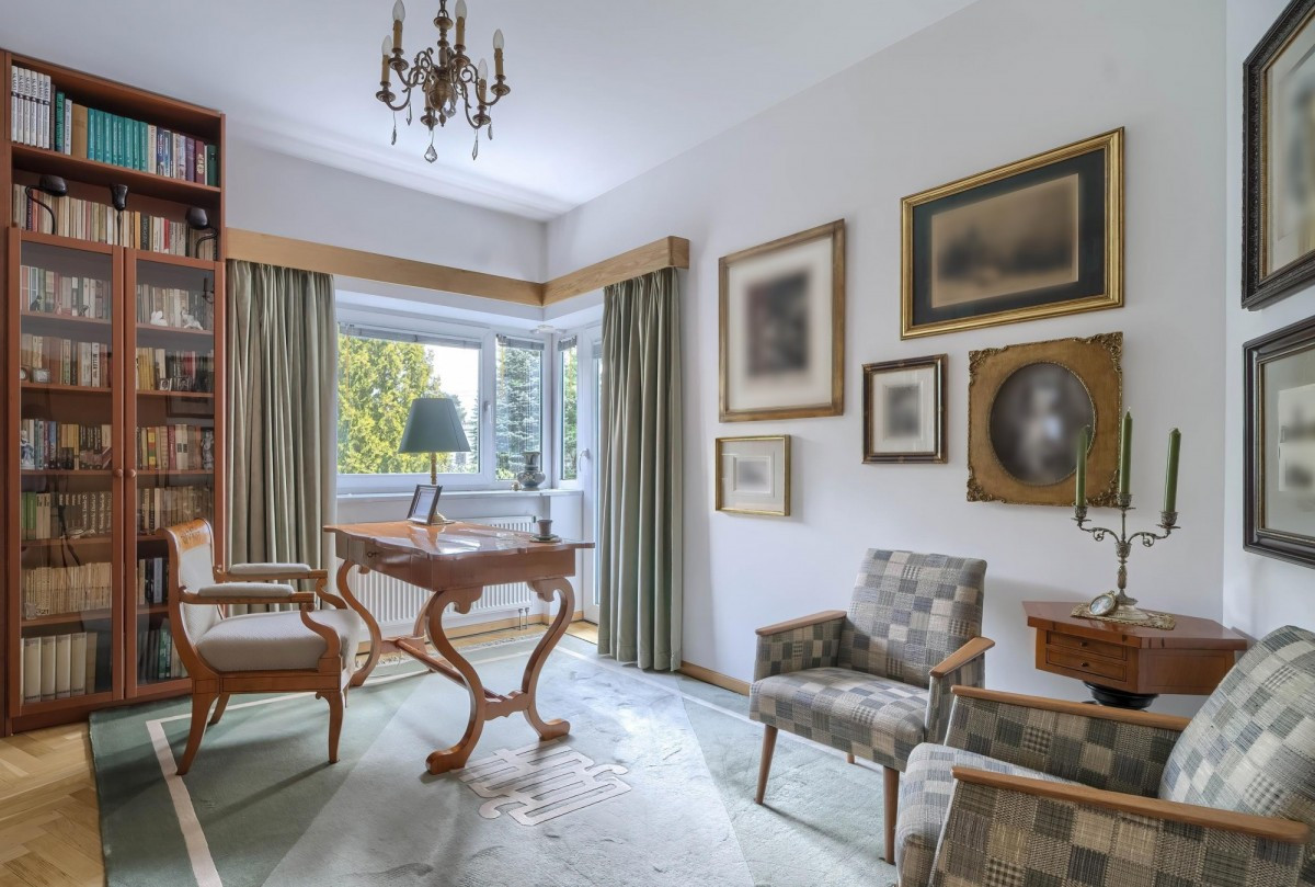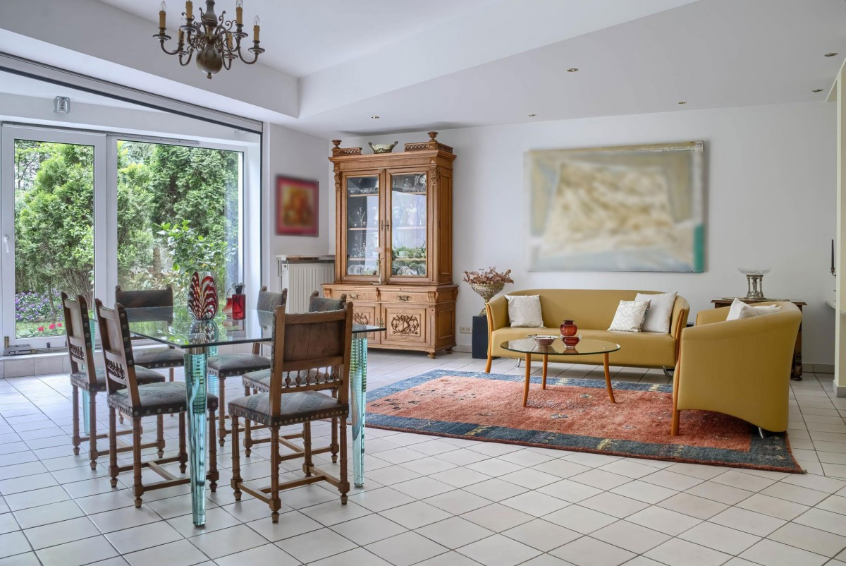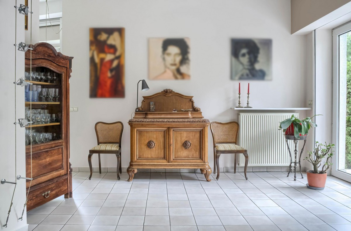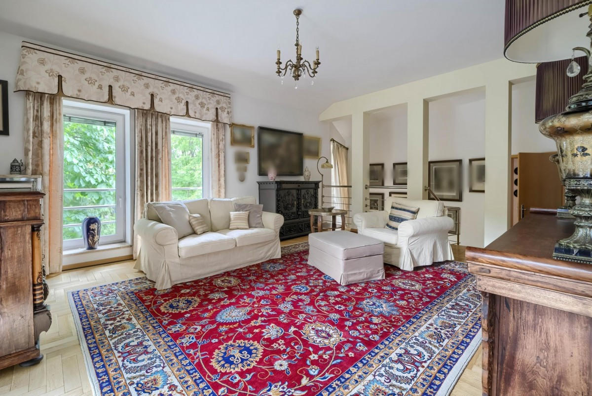 Układ funkcjonalny: dwa osobne lokale, w sumie 10 pokoi; w tym 2 przestronne salony z jadalnią, z których jest możliwość wyjścia odpowiednio na 2 tarasy z widokiem na zadbany ogród z miejscem na grilla, 6 łazienek, 3 balkony oraz garażu z miejscem na 1 auto i miejsca postojowego przed budynkiem.