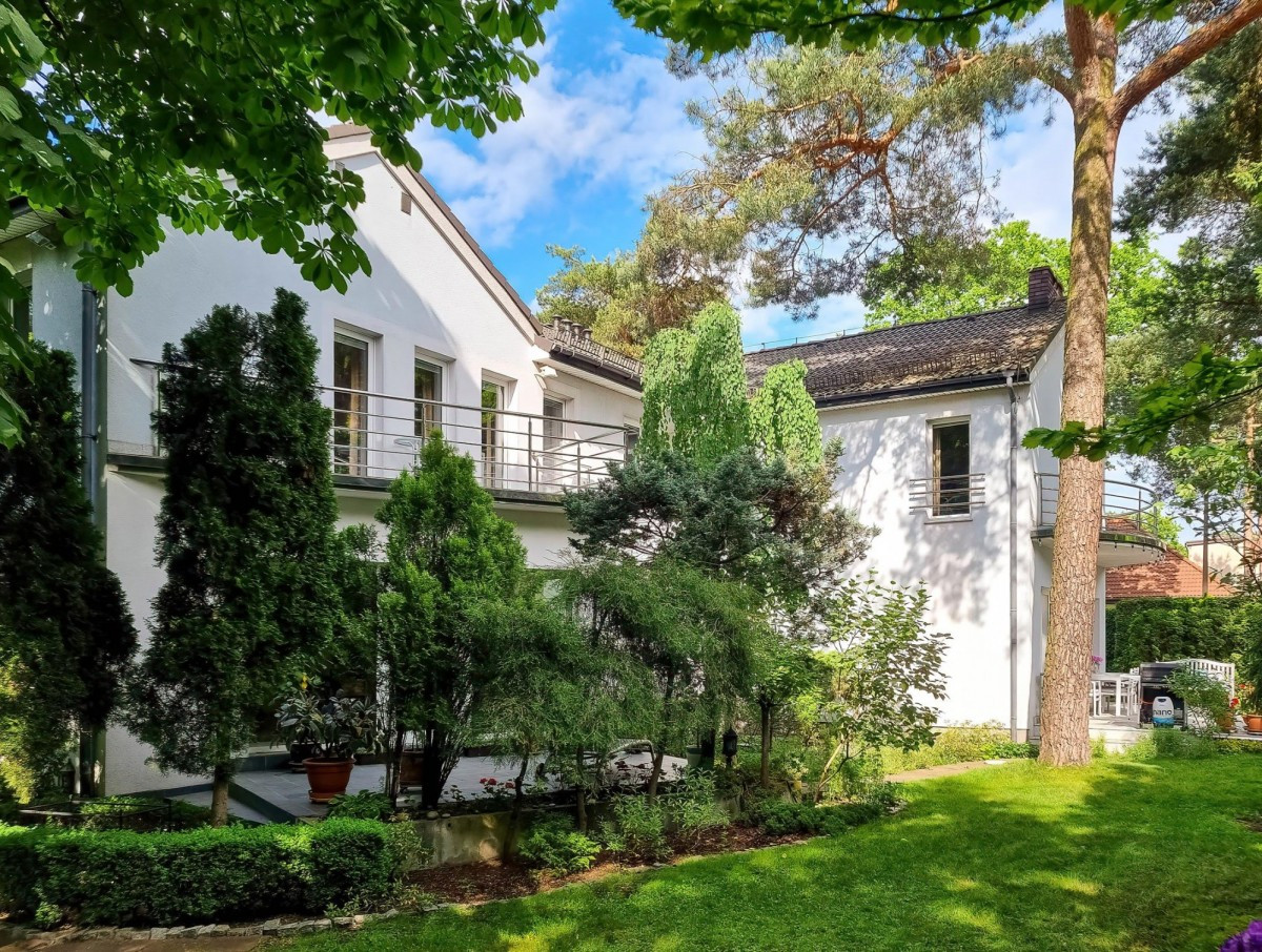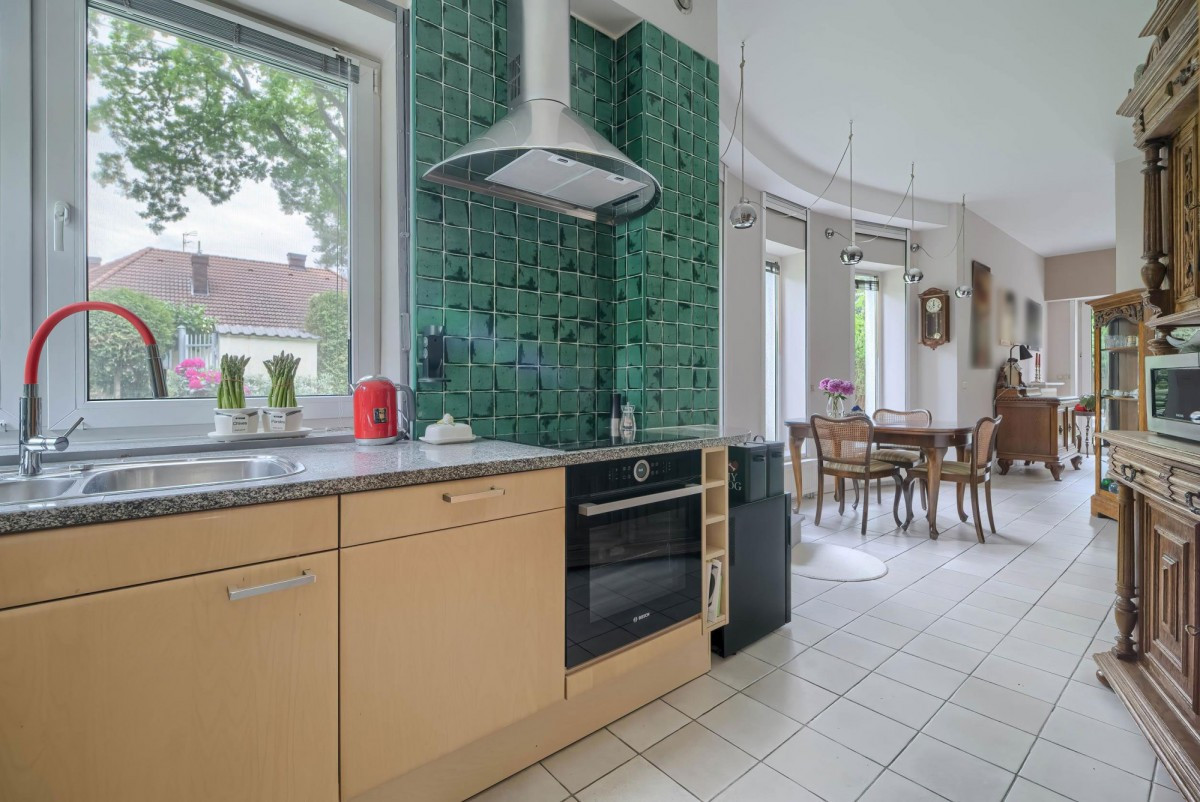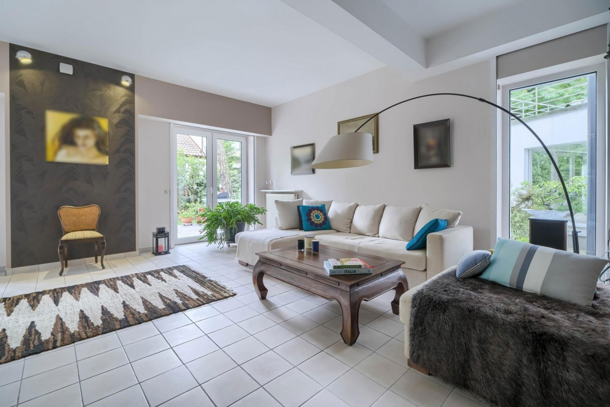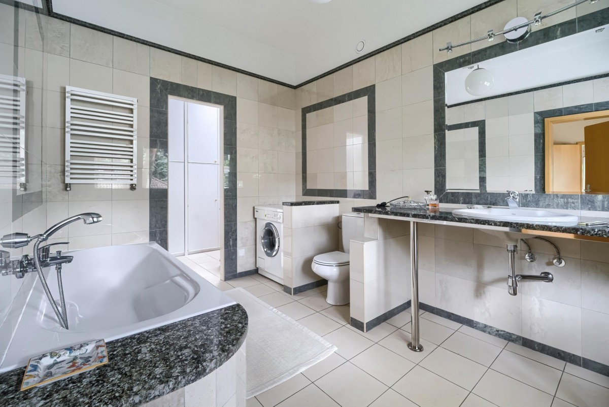 Układ funkcjonalny: dwa osobne lokale, w sumie 10 pokoi; w tym 2 przestronne salony z jadalnią, z których jest możliwość wyjścia odpowiednio na 2 tarasy z widokiem na zadbany ogród z miejscem na grilla, 6 łazienek, 3 balkony oraz garażu z miejscem na 1 auto i miejsca postojowego przed budynkiem.