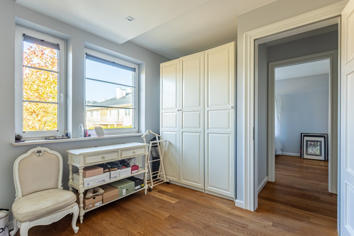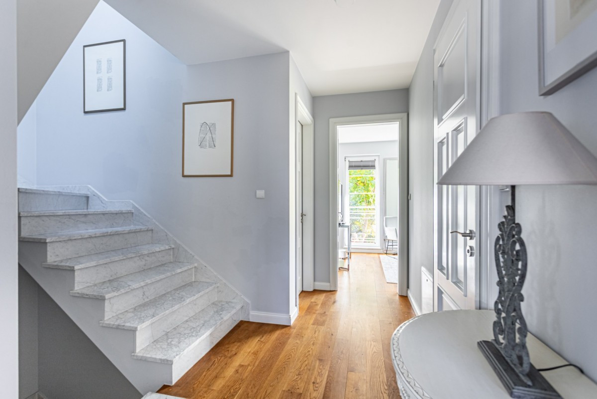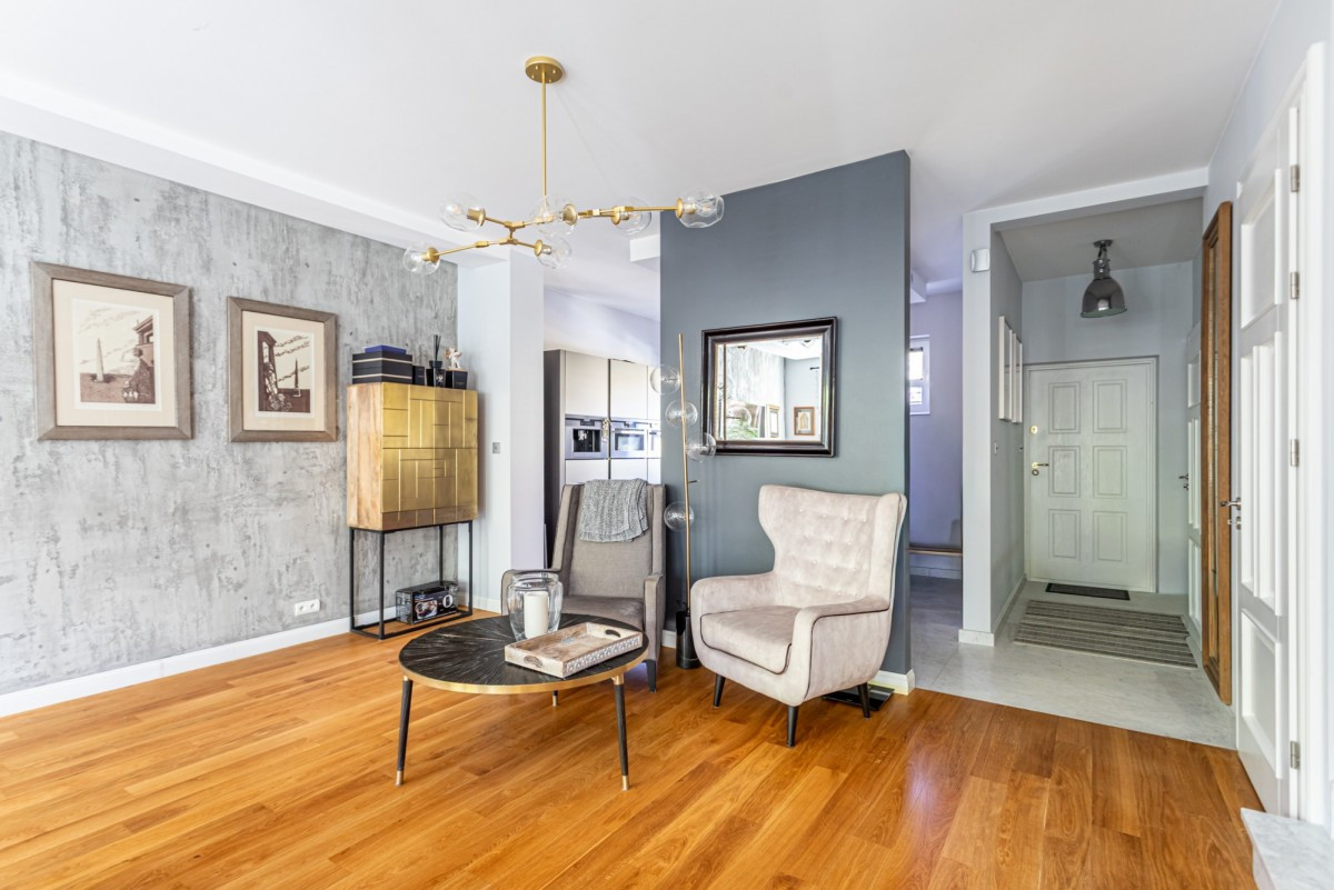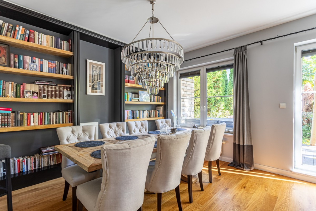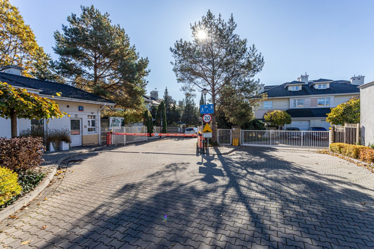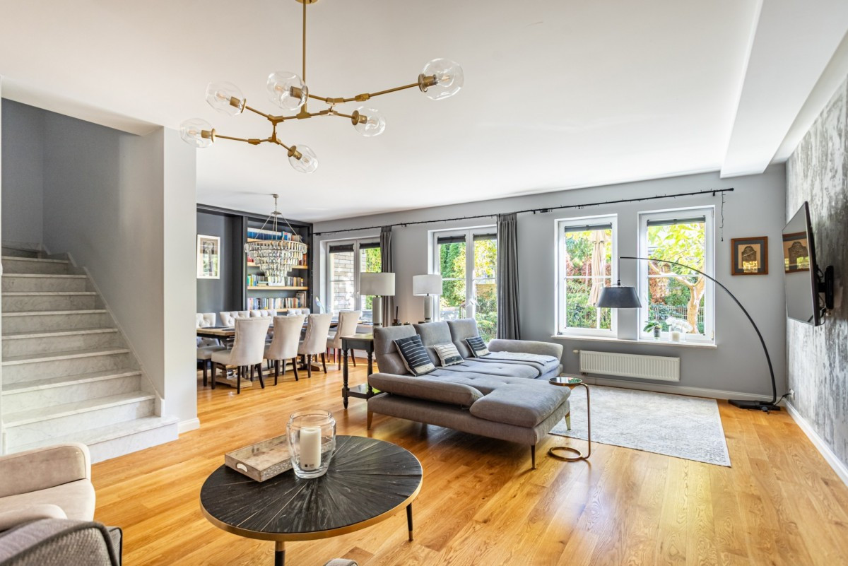 Dom w zabudowie szeregowej o powierzchni całkowitej ok. 200m2, posadowiony na działce o powierzchni ok. 185m2. Na dolnym poziomie znajduje się salon z wyjściem na taras z całorocznym jacuzzi i do ogrodu, częściowo otwarta kuchnia, garderoba, pralnia oraz garaż na 1 samochód. Na 1. piętrze są 4 pokoje (2 z nich z wyjściem na wspólny, zadaszony taras) i łazienka wyposażona w prysznic i dużą wannę. Poddasze zaaranżowane jest jako otwarta przestrzeń, na której znajduje się sypialnia, część łazienkowa z wolnostojącą wanną oraz garderoba. Dom wykończony jest w bardzo wysokim standardzie. Na podłogach w pokojach znajdują się olejowane deski dębowe, w łazienkach i w kuchni granit (w tych pomieszczeniach podgrzewana podłoga), kuchnia jest kompletnie wyposażona w wysokiej klasy sprzęt AGD.