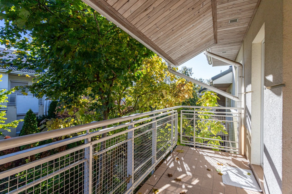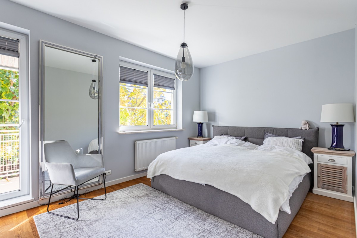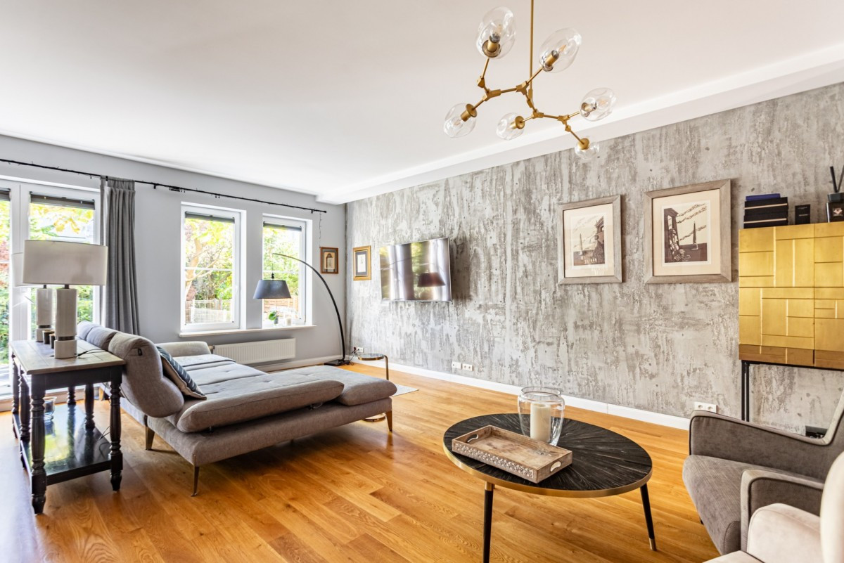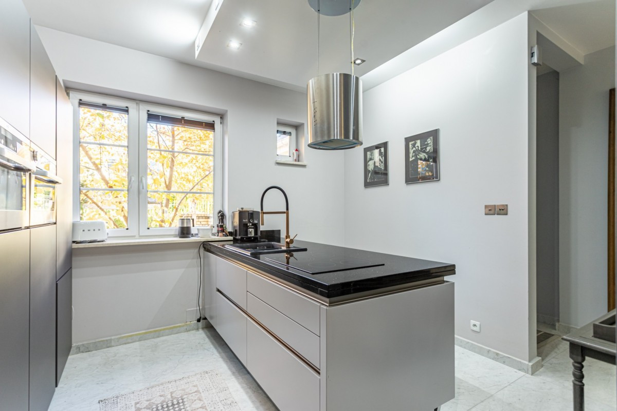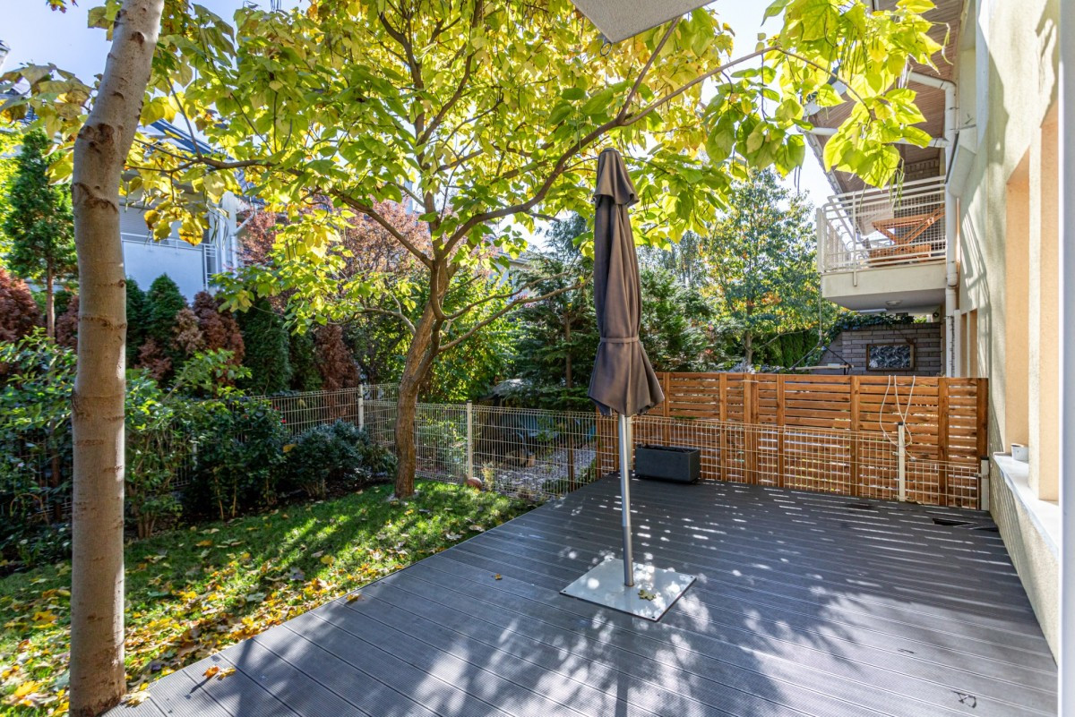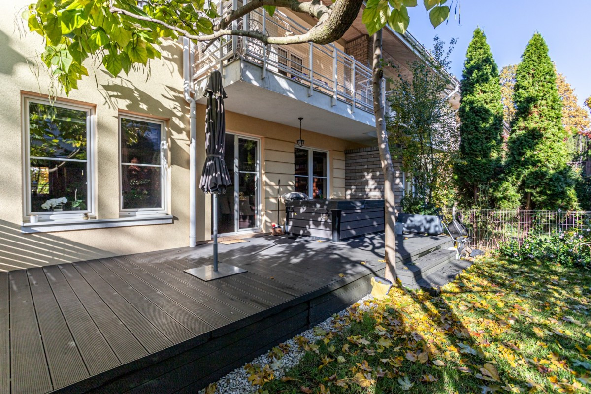Dom w zabudowie szeregowej o powierzchni całkowitej ok. 200m2, posadowiony na działce o powierzchni ok. 185m2. Na dolnym poziomie znajduje się salon z wyjściem na taras z całorocznym jacuzzi i do ogrodu, częściowo otwarta kuchnia, garderoba, pralnia oraz garaż na 1 samochód. Na 1. piętrze są 4 pokoje (2 z nich z wyjściem na wspólny, zadaszony taras) i łazienka wyposażona w prysznic i dużą wannę. Poddasze zaaranżowane jest jako otwarta przestrzeń, na której znajduje się sypialnia, część łazienkowa z wolnostojącą wanną oraz garderoba. Dom wykończony jest w bardzo wysokim standardzie. Na podłogach w pokojach znajdują się olejowane deski dębowe, w łazienkach i w kuchni granit (w tych pomieszczeniach podgrzewana podłoga), kuchnia jest kompletnie wyposażona w wysokiej klasy sprzęt AGD.