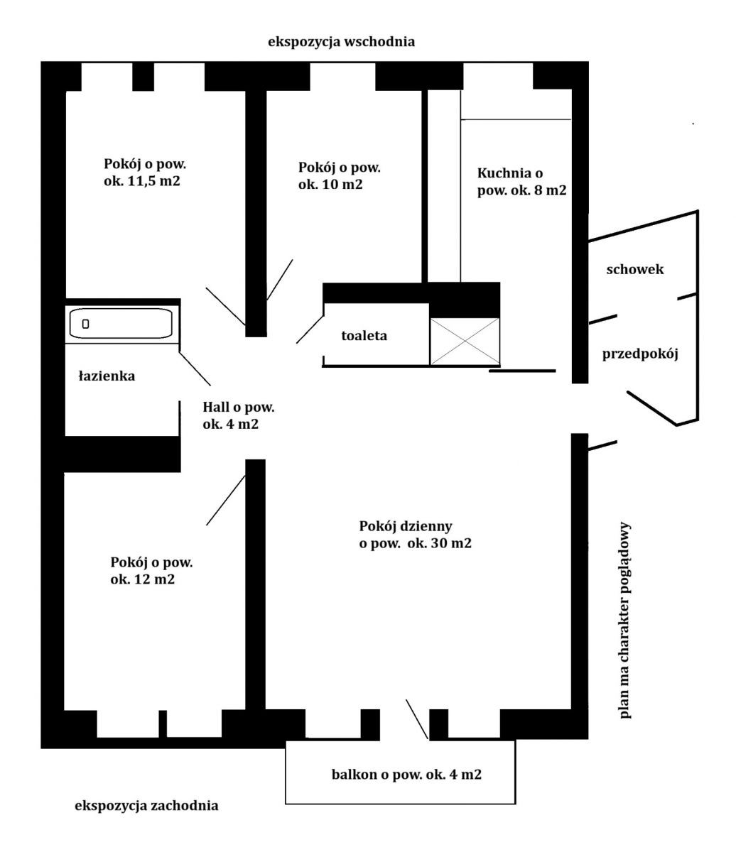 Mieszkanie ma pow. 85,34 m2 i składa się z pokoju dziennego o pow. ok. 30 m2, trzech sypialni o pow. 12/ 11,5/ 10 m2, samodzielnej kuchni o pow. ok. 8 m2, łazienki o pow. ok. 4,6 m2 (wyposażonej w dużą wannę), osobnej toalety o pow. ok. 1,6 m2, a także schowka i przedpokoju. Z pokoju dziennego można wyjść na balkon o pow. ok. 4 m2.