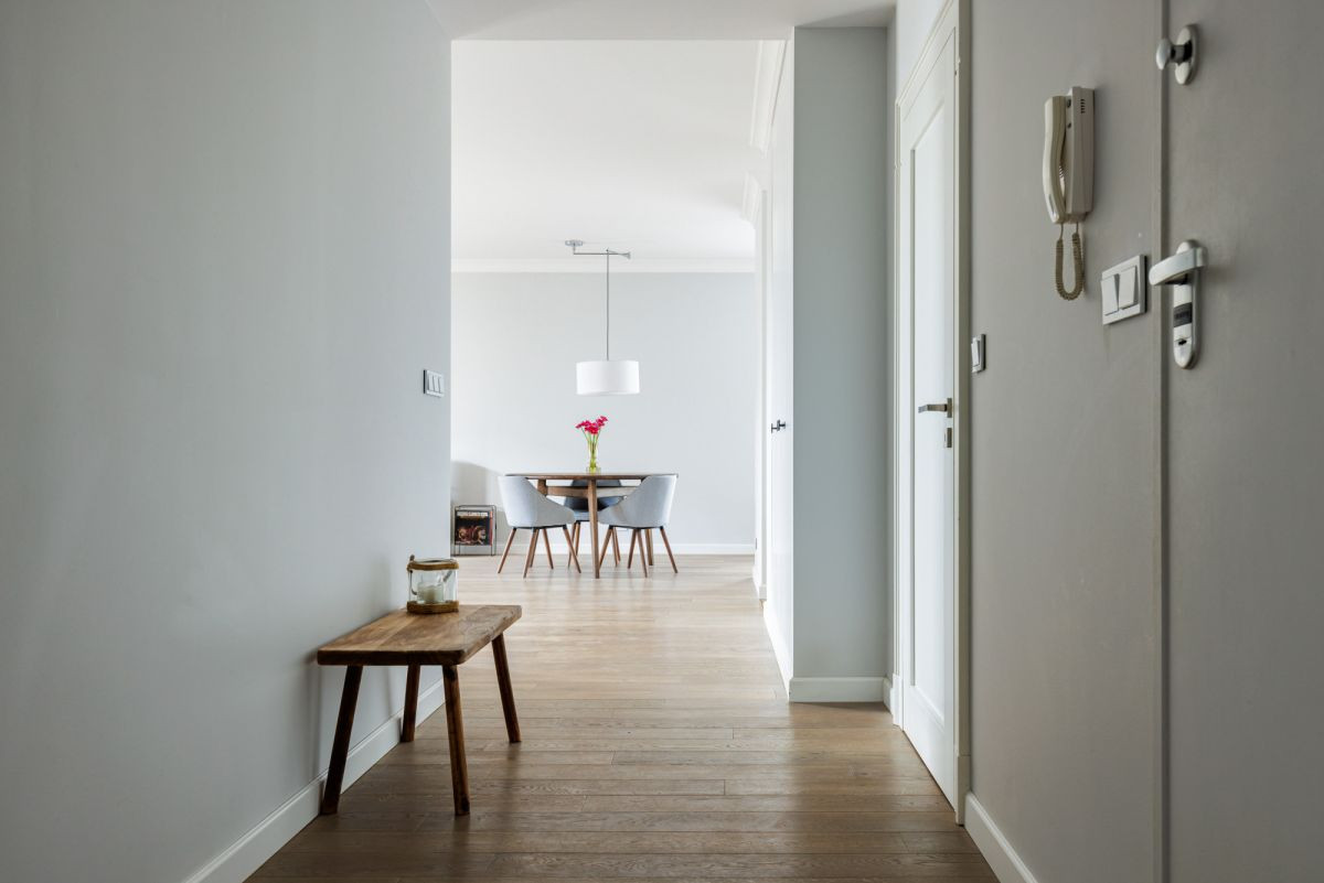 Hall z dużymi w pełni zabudowanymi szafami.