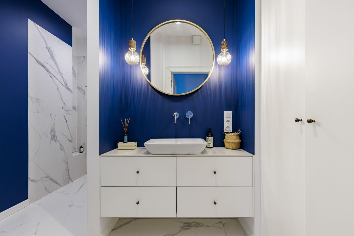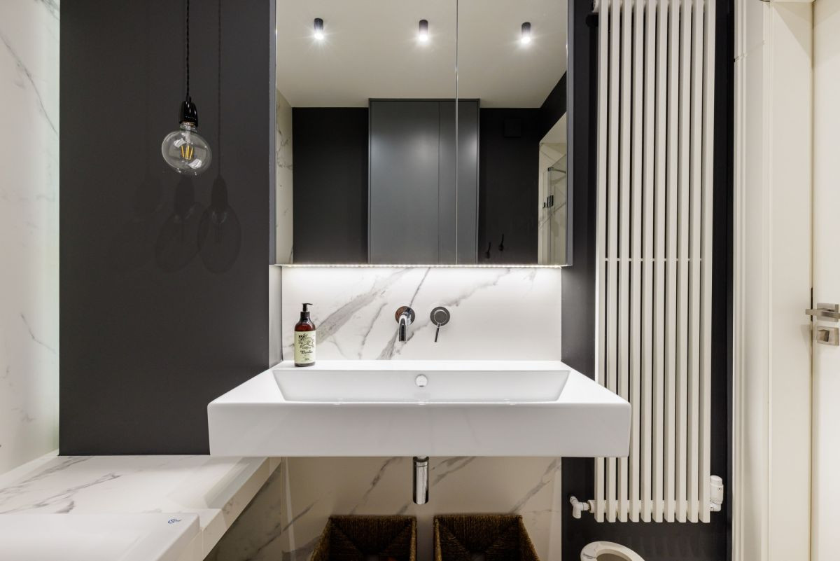 Strefa techniczna z pralnią, wydzielona w łazience, ułatwiająca codzienne funkcjonowanie.