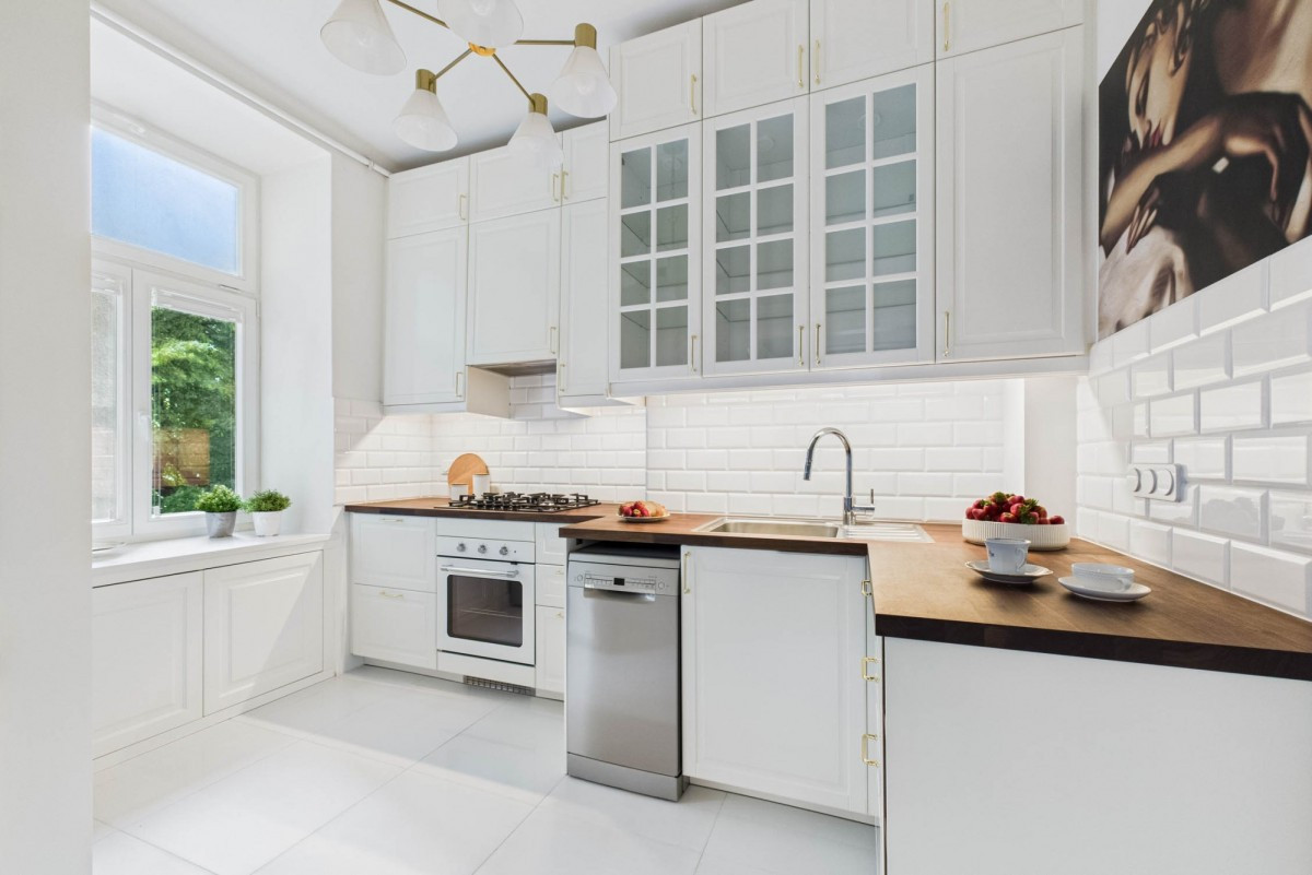 • Kuchnia z oknem: zabudowa na wymiar, kuchenka gazowa, piekarnik, zmywarka i... Tamara Łempicka na ścianie. Zachowana również oryginalna „zimna szafka” - idealna na domowe przetwory.