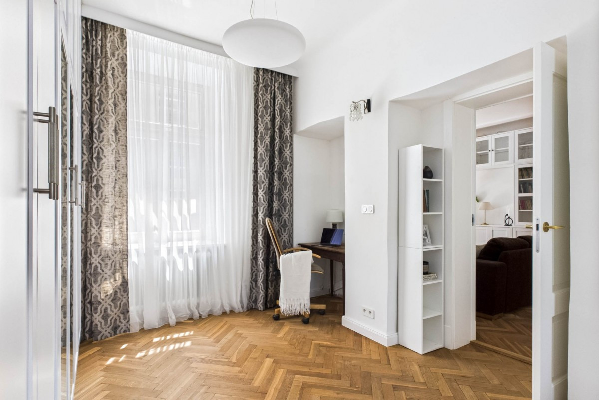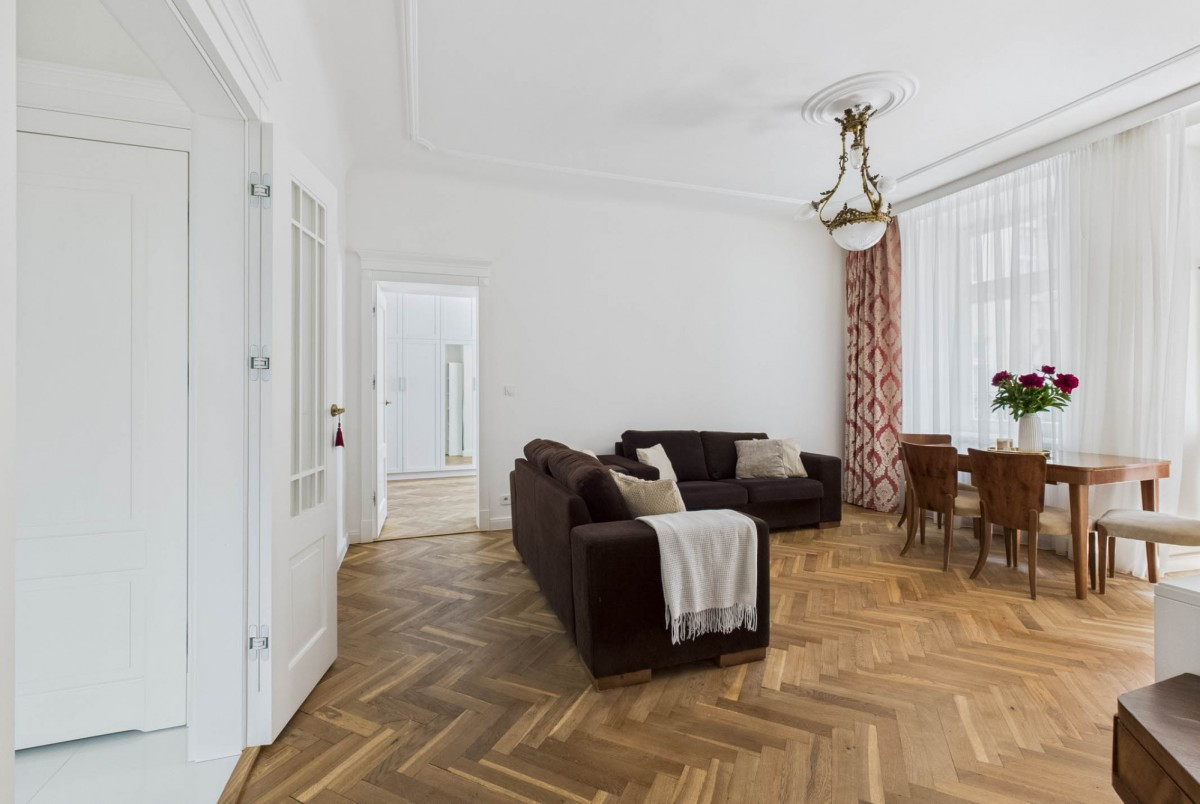 W salonie i sypialni zachowano oryginalny, przedwojenny parkiet - został odrestaurowany i zaolejowany. Klimat wnętrza podkreśla drewniana stolarka okienna i drzwiowa (nowa), sztukateria sufitowa oraz mosiężne klamki.