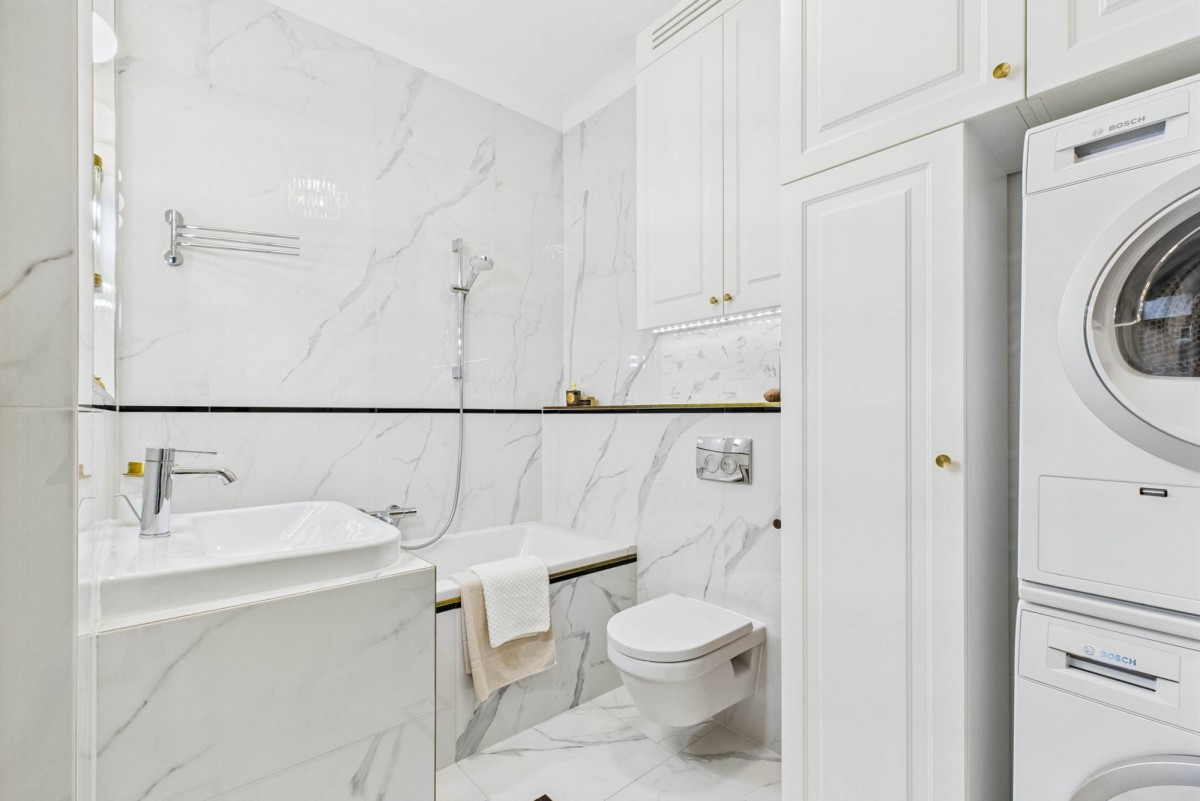 • Łazienka z wanną i WC: ceramika Villeroy & Boch, armatura Grohe, pralka i suszarka Bosch, stylowe mosiężne detale i funkcjonalna zabudowa.