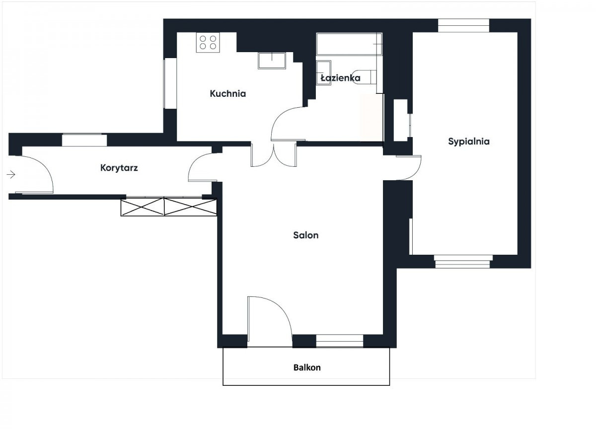 • Sypialnia z dwoma oknami na przeciwległych ścianach: pojemne szafy, łóżko 180 cm z dużym pojemnikiem, miejsce na biurko lub łóżeczko dziecięce. Możliwość łatwego wydzielenia dwóch niezależnych pokoi.