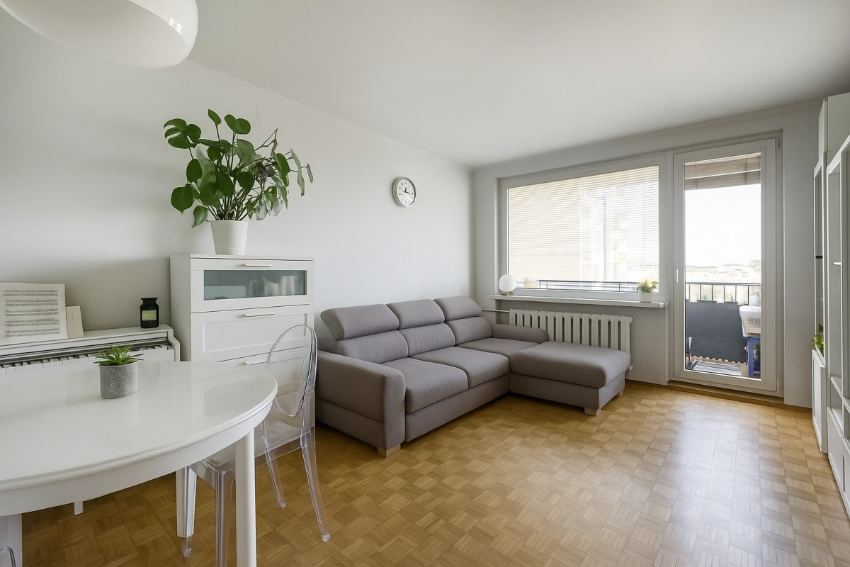 Salon z wyjściem na duży balkon z widokiem na zachód