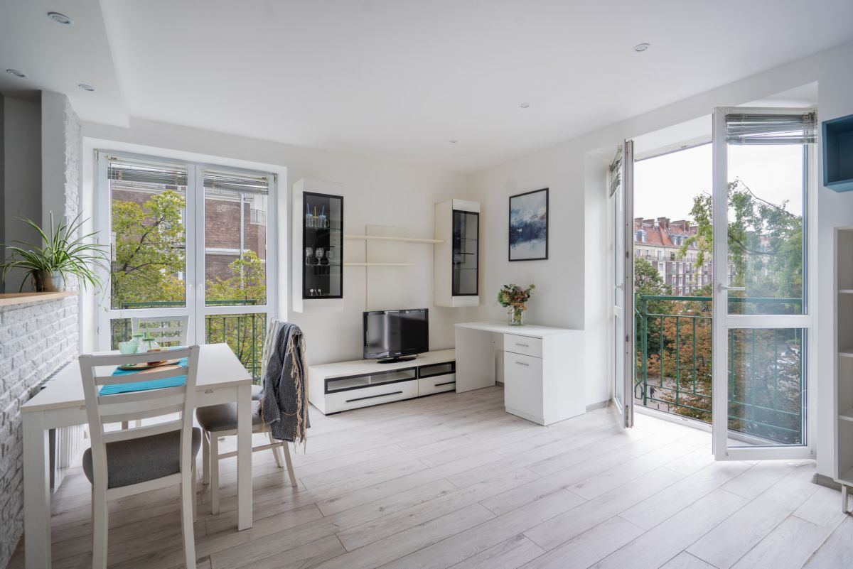 Nieruchomość mieści się na trzecim piętrze w pięciopiętrowym budynku z 1953 roku. Mieszkanie ma powierzchnię 35 m2. Składa się z pokoju z aneksem sypialnianym (możliwość oddzielenia od części dziennej), dużej osobnej kuchni z oknem do pokoju oraz przestronnej łazienki z wanną. Okna skierowane na wschód i na północ - oba francuskie (sięgają do podłogi). Duże okna sprawiają, że mieszkanie jest pełne światła. Za oknami piękne widoki na korony drzew.