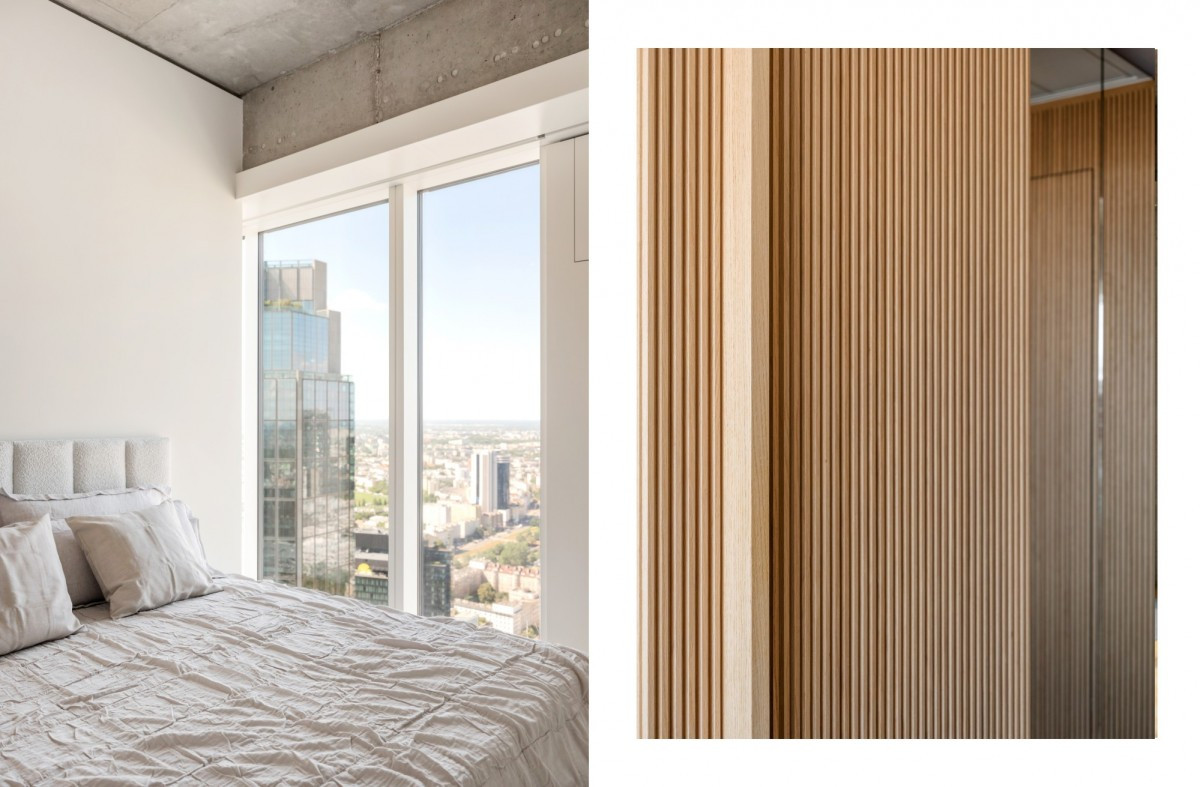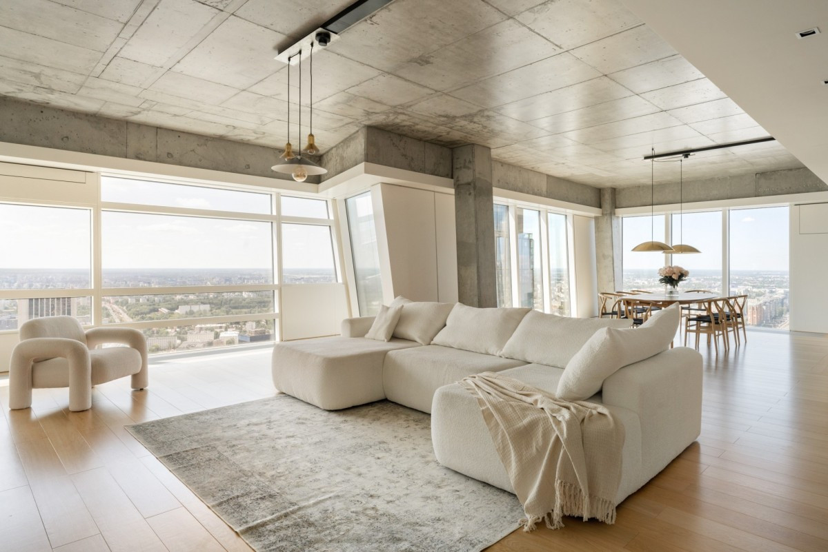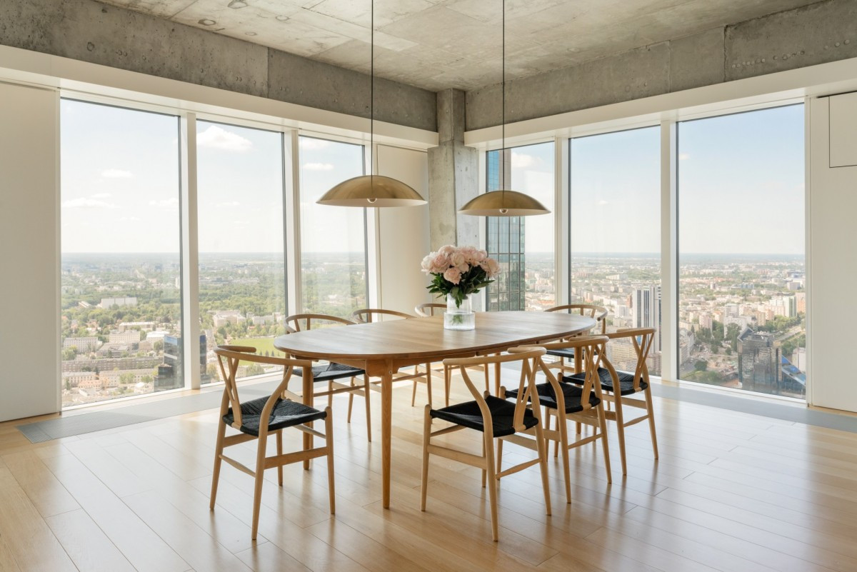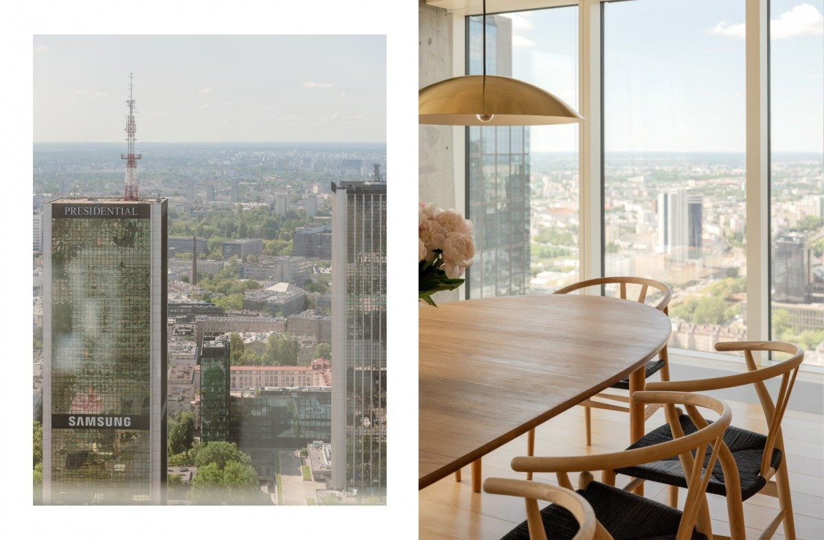The apartment’s interior has been carefully arranged to ensure comfort, practicality, and aesthetic harmony.A spacious living room with large panoramic windows offers a breathtaking view of Warsaw and is flooded with natural light.The living area flows into an elegant dining space and a modern kitchen equipped with top-class Gaggenau appliances.