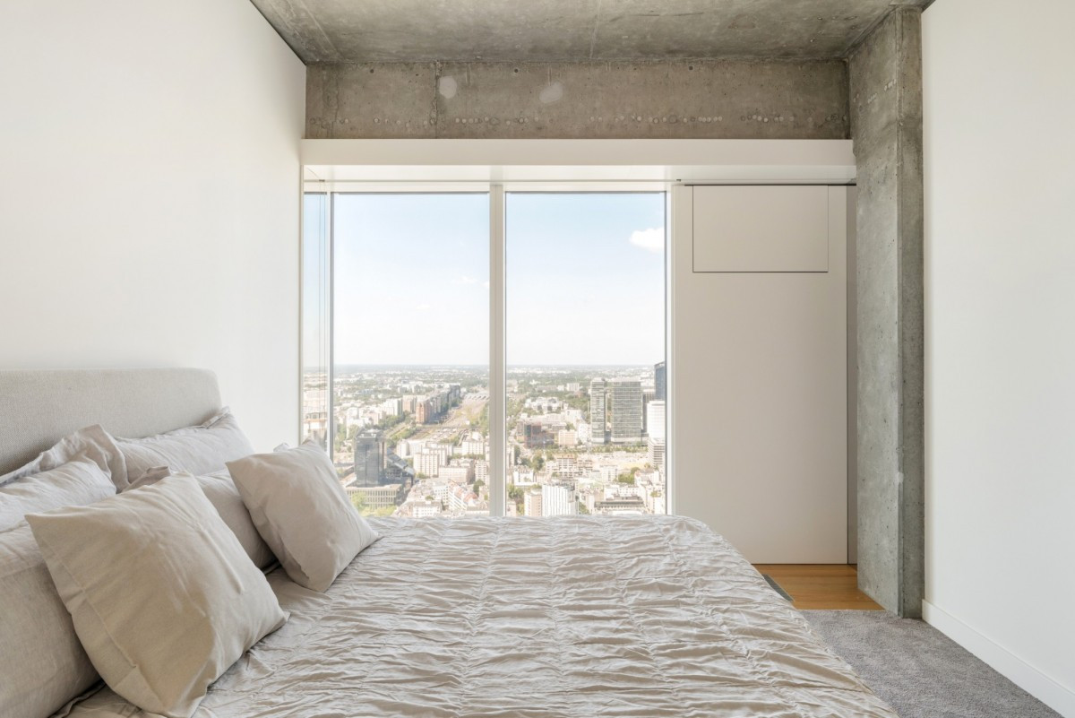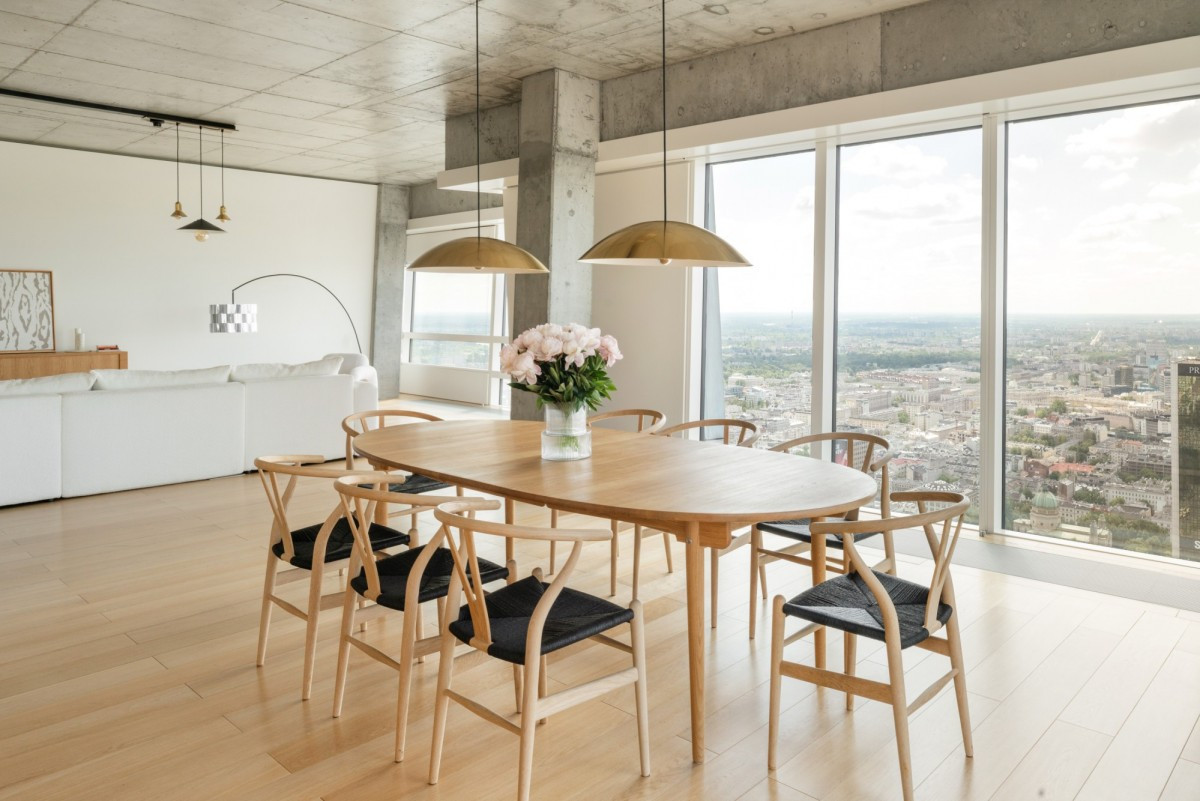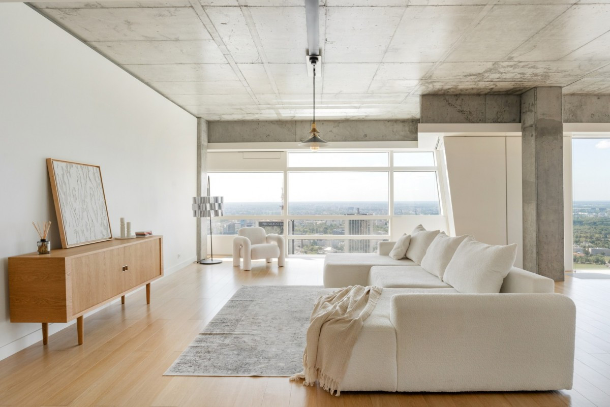 Wnętrze apartamentu zostało starannie zaprojektowane z myślą o komforcie, funkcjonalności i estetyce. Przestronny salon z dużymi, panoramicznymi oknami oferuje spektakularny widok na Warszawę i zachwyca ilością naturalnego światła. Strefa dzienna łączy się z elegancką jadalnią oraz nowoczesną kuchnią wyposażoną w najwyższej klasy sprzęt marki Gaggenau.