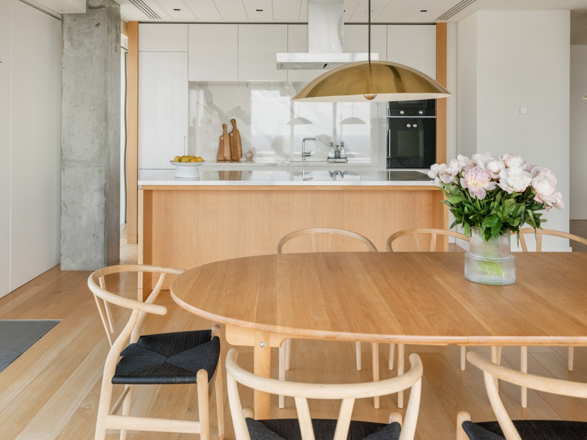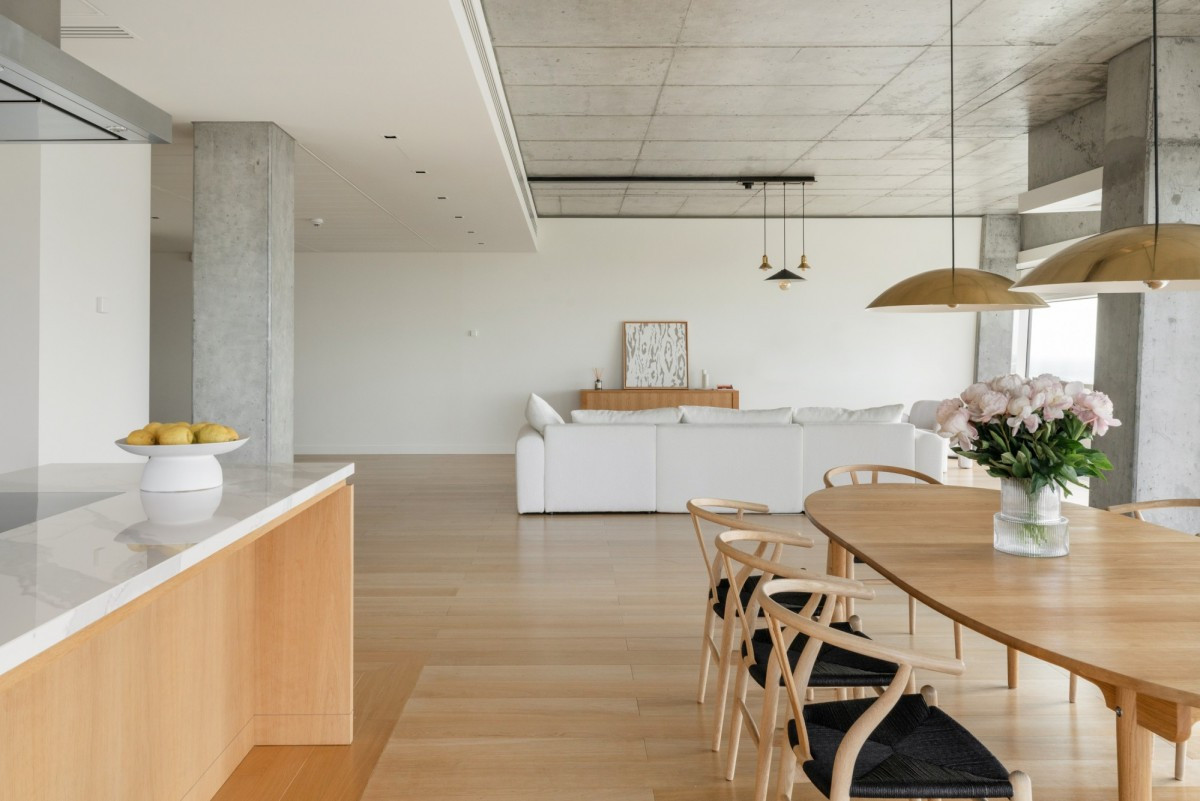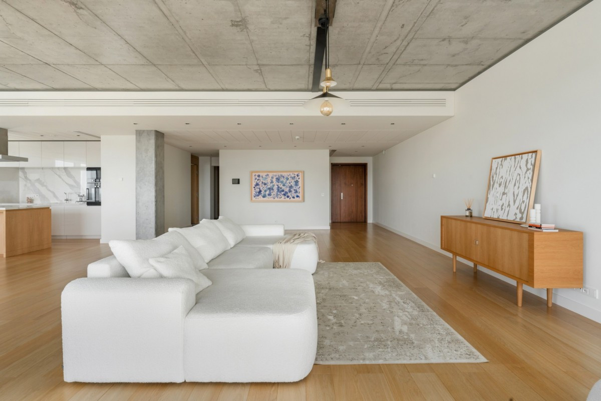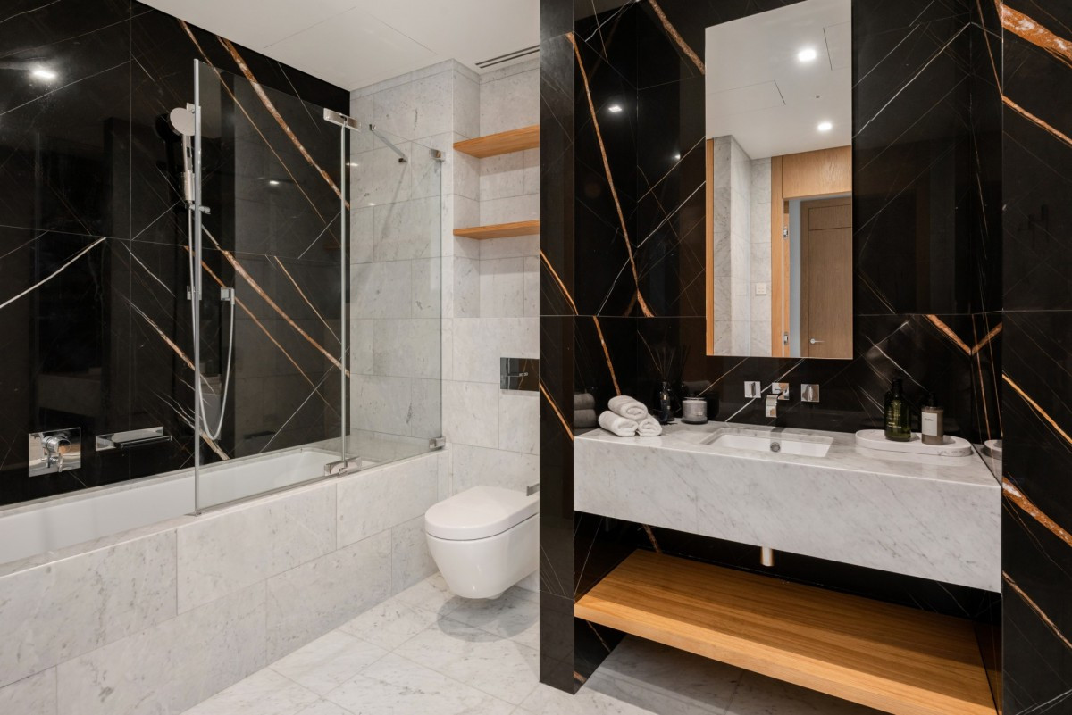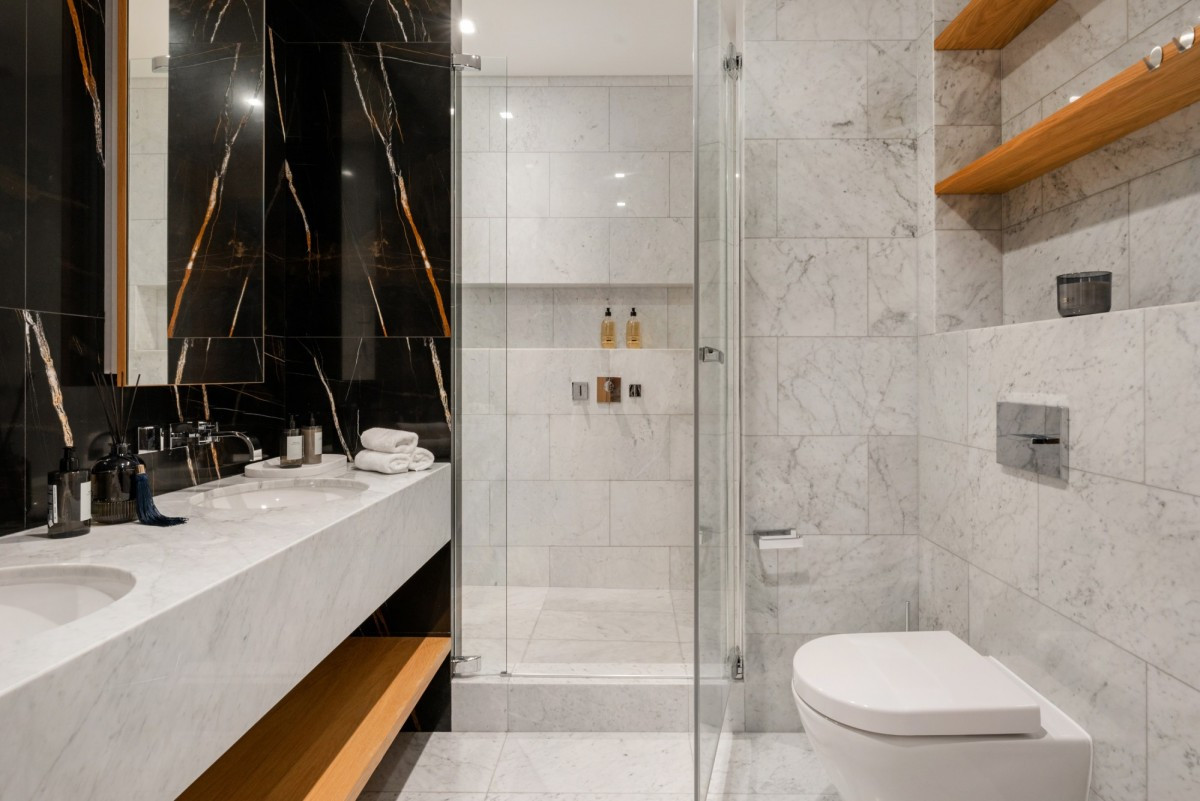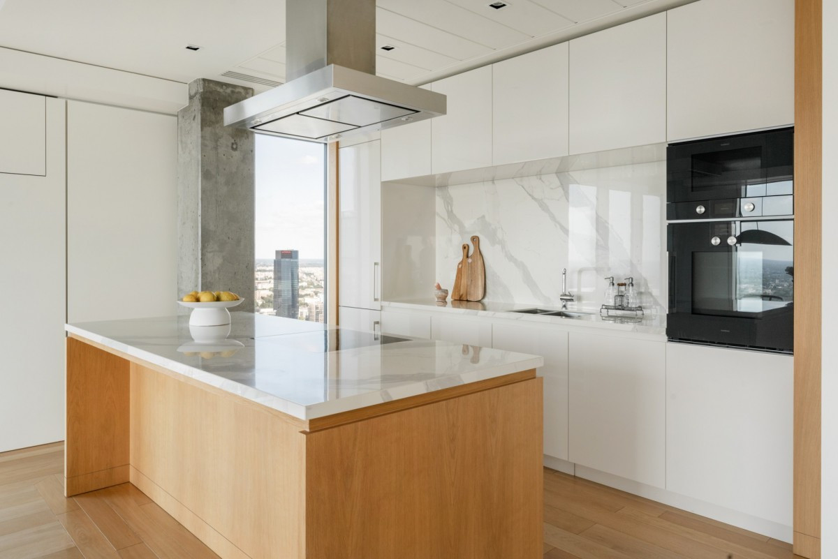 Włoski marmur Carrara Gioia i Black Aziza, naturalne podłogi z dębu, stylowe betonowe akcenty, podgrzewane podłogi w łazienkach, centralna klimatyzacja oraz inteligentny system sterowania obsługiwany za pomocą aplikacji.