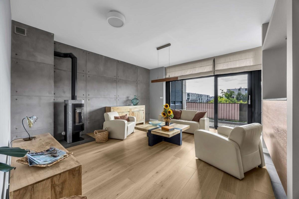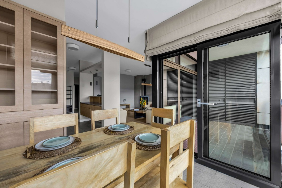 - Przestronny salon z działającym kominkiem oraz z wyjściem na taras,