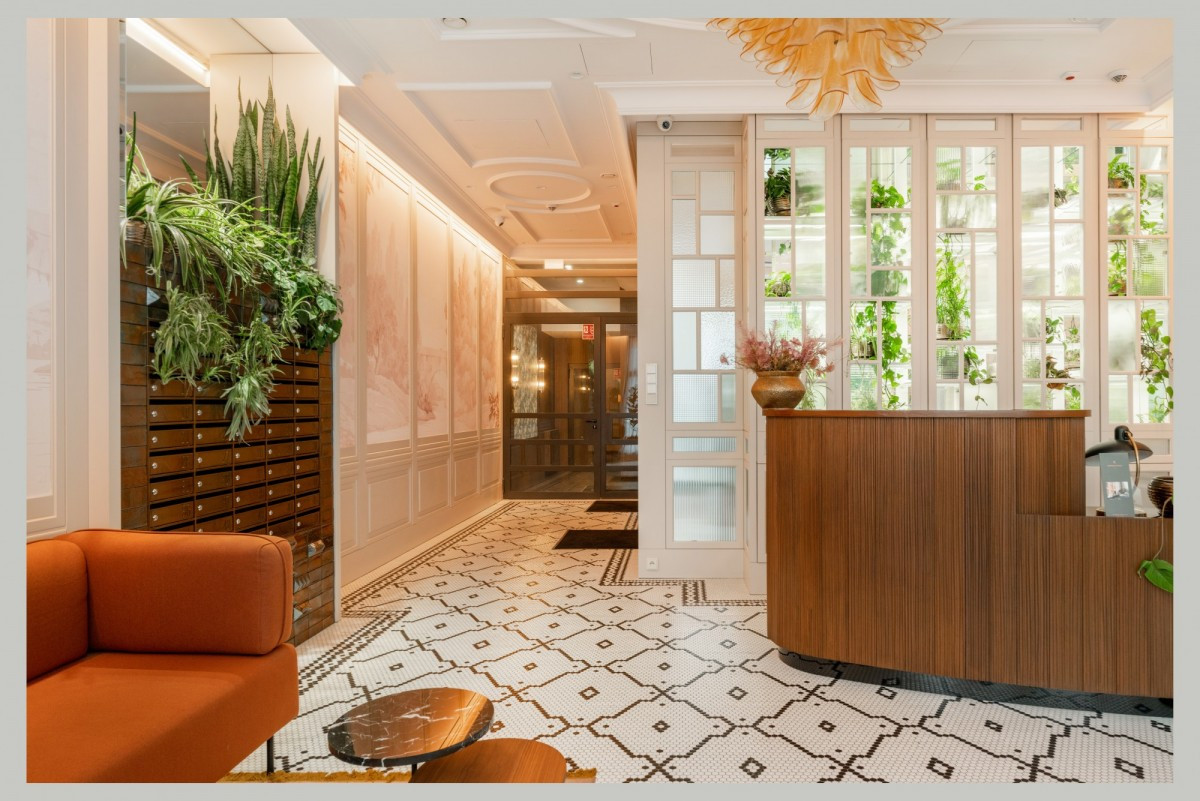 An intimate apartment building from 2022. It has all amenities such as security, reception, garage with remote control entry, smart home system. The building is distinguished by beautifully designed common areas by the famous Barcelona studio Studio Lazaro.