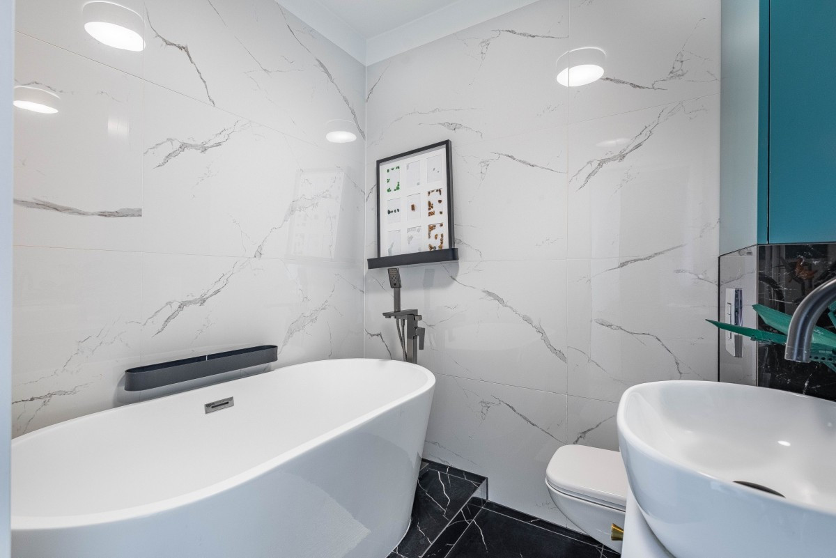 - Łazienka z wanną i toaletą
